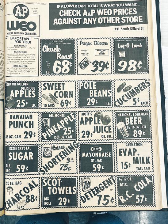 Boogarts in Ocoee advertised they had the lowest meat prices in Central Florida, specializing in freezer beef orders cut and wrapped to shoppers’ specifi cations. In November 1972, beef loin was less than one dollar a pound and boneless New York strip was $1.89 per pound. Need milk? You paid 99 cents, and that likely was for a gallon. In Winter Garden, A&P of fered deals on chuck roast (68 cents per pound) and leg of lamb (98 cents per pound), as well as apples (25 cents per pound), cucumbers (a nickel apiece) and six bottles of R.C. Cola (57 cents).