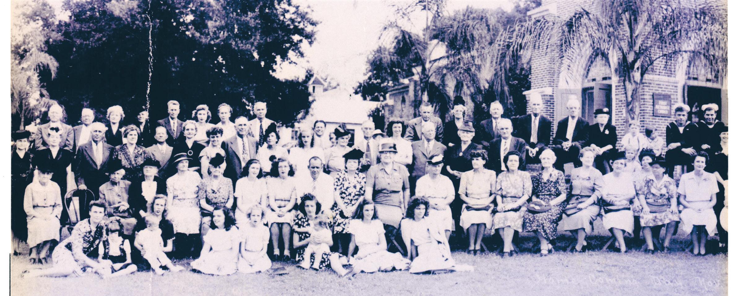 These two images form a panoramic view showing attendees at a First United Methodist Church homecom ing. The occasion was photographed Nov. 10, 1946 — 77 years ago. A total of 136 members gathered for fel lowship under the aegis of the Rev. Jesse E. Waller, who served as pastor from 1946-51. During his tenure, the Educational Building was constructed; the parsonage was remodeled; and the fellowship hall and chapel were in place. By 1949, a library was established and audiovisual equipment was acquired.