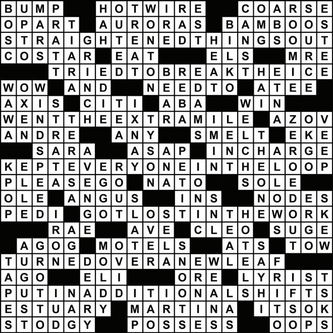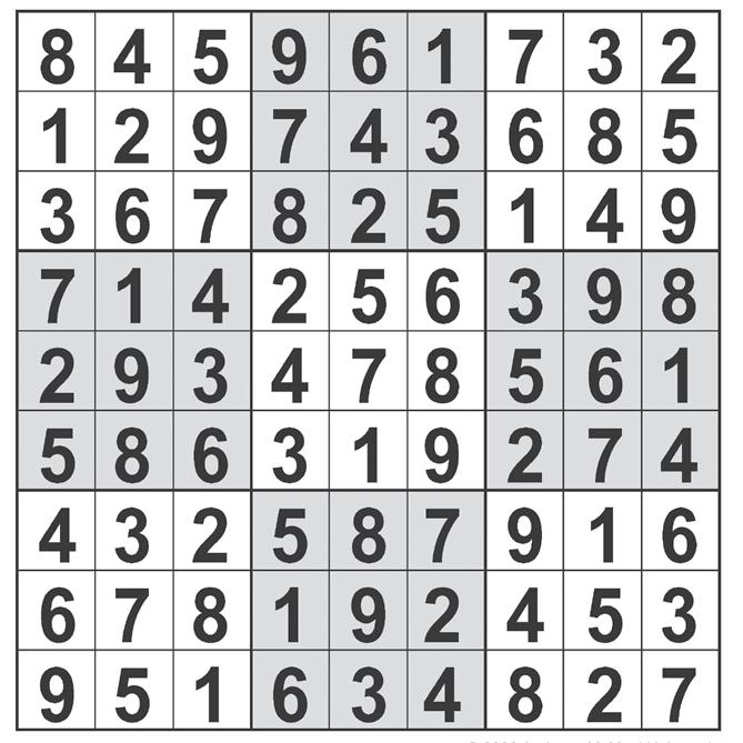 the grid so that every row, column and 3x3 box contains every digit from 1 to 9 inclusively. ©2023 Andrews McMeel Syndicate crossword ©2023 Universal Uclick ACROSS 1 Volleyball touch 5 Illegal start? 12 Far from fine 18 Some abstract visuals 20 Night lights? 21 Some mahjong tiles 22 “It’s so unfair! I lost my job making boomerangs, even after I ___!” 25 One who gets half the credit 26 Opposite of fast 27 Chicago trains 28 G.I. fare 29 “I got fired as a Zamboni driver, even after I ___!” 36 “Jinkies!” 39 Plus 40 Absolutely must 41 Done to ___ 42 Turning point? 44 Big name in banking 47 Court org. 48 Part of FTW 49 “I got canned as a taxi driver, even after I ___!” 54 Russian sea 58 Giant who was in “The Princess Bride” 59 “___ minute now” 60 Silvery fish 62 Scratch (out) 63 Ramirez of “Grey’s Anatomy” 65 “PDQ!” 68 Running things 70 “I lost my job roping cattle with the ranch crew, even after I ___!” 75 Polite dismissal 76 Grp. with a phonetic alphabet 77 Single 78 Root word? 79 Cattle breed 81 Network connections 83 Network junctions 86 Mani-___ 88 “I got fired from making hedge mazes, even after I ___!” 93 Actress Issa 95 Part of a Waze rte. 96 Jazz singer Laine 97 Rap mogul Knight 98 Wide-eyed with excitement 100 Super 8 and others 103 @@@ 105 Pull 106 “I was terminated at Nissan’s electric car factory, even after I ___!” 111 Dating term? 112 Yalie 113 Underground band 114 Orpheus, notably 118 “I got fired from making keyboards, even after I ___!” 125 River mouth area 126 Country singer McBride 127 “No harm, no foul” 128 Tediously old-fashioned 129Have 130 Klutz’s comment DOWN 1 Bartlett kin 2 Until 3 Starburst producer 4 Chris who plays Star-Lord 5 “So there!” 6 Blew one’s cover 7 Pay for 8 Chinese dumpling 9 Red state? 10 “Far out, man!” 11 Ballpark fig. 12 Biblical verb 13 Texter’s “Holy smokes!” 14 Core components 15 Bunkmate 16 Tip provider 17 First name in cosmetics 19 Royal headwear 21 Steve Martin’s scheming sergeant in 1996 23 Jim Carrey’s scheming meanie in 2000 24 Miami’s NBA team 30 Emmy-winning Falco 31 Stomach or shoulder 32 Country’s McEntire 33 Coated Dutch cheeses 34 Osaka assent 35 European hot spot 36 Sip from a sippy cup 37 Teammates with pull? 38 What the Beaufort scale measures 43 Layers 45 Tazo offering 46 “Nuh-uh” 48 Jam and juice brand 50 Mother ___ 51 “Everyone has a plan until they get punched in the mouth” speaker 52 “Let’s do this thing!” 53 Mardi Gras follower 55 Reset, in a way 56 Indie band known for its elaborately choreographed videos 57 Gov. position turned down by Daniel Webster, allegedly saying, “I do not propose to be buried until I am really dead and in my coffin” 61 Neo, to Trinity 64 Even the score 66 Actress de Armas 67 Small, to Simone 69 Gives the go-ahead 70 Genre for BTS 71 Palindromic beauty magazine 72 Big name in the freezer aisle 73 Steamroll, in sports 74 Kind of bond 80 Political party list 82 TV show with a “FiveTimers Club” 84 “By that reasoning ... “ 85 Throw off balance 87 Go to press? 89 “Your turn to speak” 90 Actress Ward 91 Color worn by the San Jose Sharks 92 Hyatt and Hilton 94 Bumble bio info 98 International Mahjong Day month 99 Capri has a famous blue one 100 State where the fuzz is in plain sight? 101 Poet who wrote “To be loved, be lovable” 102 Honkers 104 “Give my regards!” 106 Catches on a security camera 107 “Sugar” 108 Bert’s 15-Down 109 Gradually removes 110 ___ pie (“walking” chili treat served in a bag) 115 “Should that be true ...” 116 “Quit it!” 117 Chiding sounds 119 OB/GYN offering 120 Noodge 121 Challenging tot 122 Confucian belief 123 Return letters? 124 ___ Vegasz