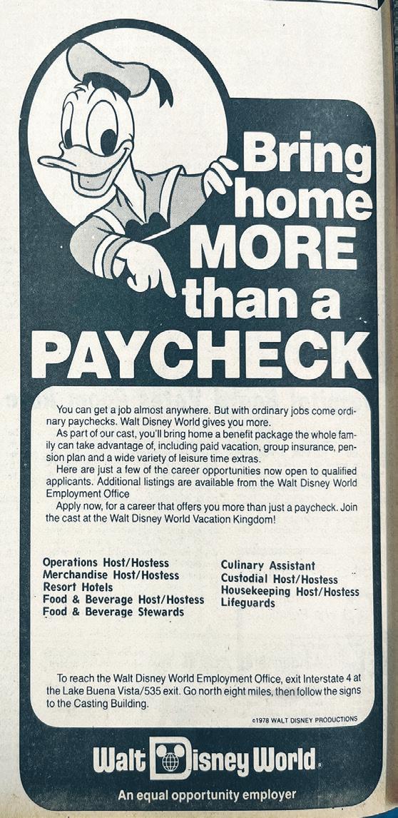Walt Disney World issued an invitation to join the cast at its Lake Buena Vista theme park in an advertisement in The Winter Garden Times in 1979. Donald Duck urged citizens to join him at the vacation kingdom and “bring home more than a paycheck.” Disney was hiring for many positions, including operations host or hostess, merchandise host or hostess, resort hotels, food and beverage host and hostess, food and beverage stewards, culinary assistant, custodial host or hostess, housekeeping host or hostess, and lifeguards.