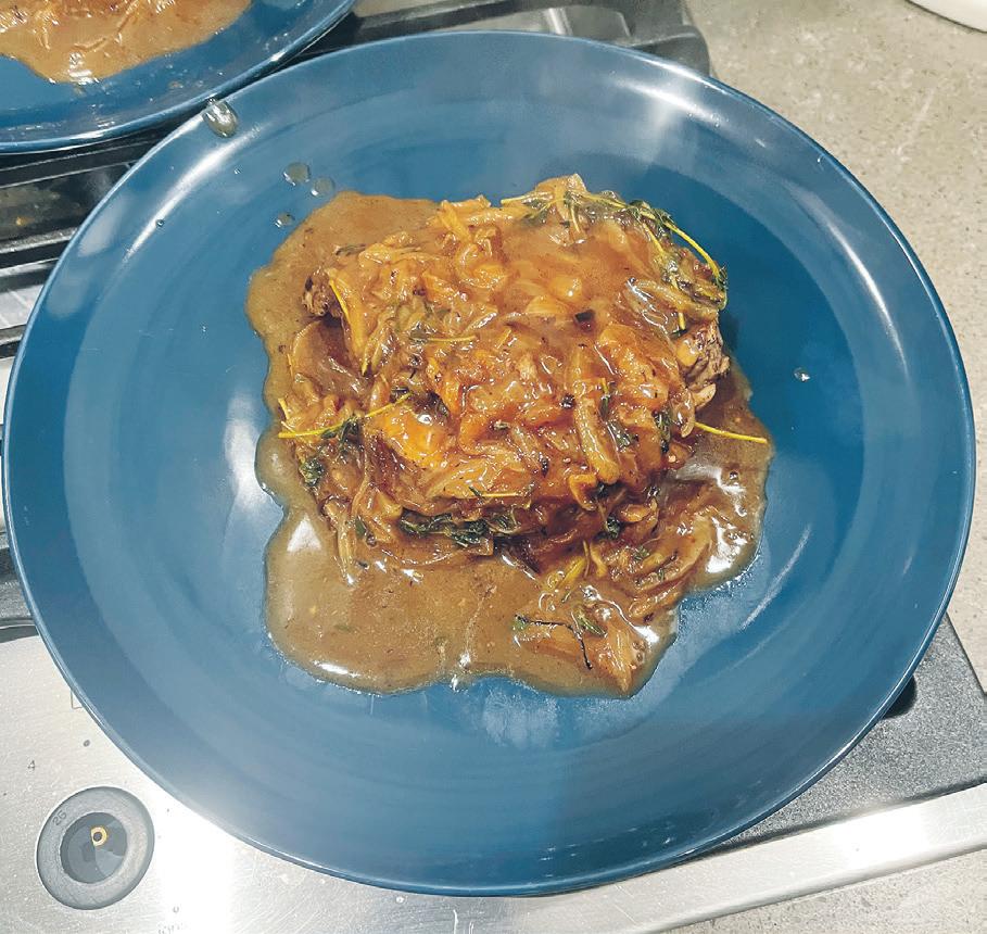 His cooking dish is enormous — big enough to cook for 12 people or 40.