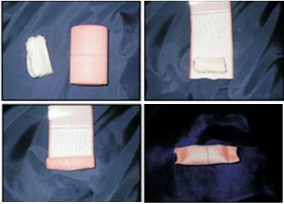 The Samadhan is another instant offloading technique discussed in Indian literature. It is described as easy to apply, affordable, and effective. In this technique, the foam is painted with an adhesive liquid and rolled into a cylinder. The cylinder is then cut to fit the size of the ulcer and is applied proximal to the ulcer. The cylinder is then secured with coban or other dressing materials. In oral abstracts, this technique allowed for 73% healing compared to 13% in footwear. This technique can also be used with the patient’s footwear, as demonstrated in the picture.8