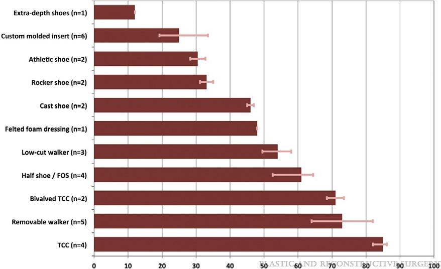Because patients can ambulate in TCCs, it is important to know the benefit of TCCs in each area of the foot. Overall, TCCs lead to an 8492% reduction in plantar pressures. If this is broken down into the individual areas of the foot, there is a 32% reduction at the 5th MPJ, a 63% reduction at the 4th MPJ, a 69% reduction at the 1st MPJ. There is a 65% reduction of pressure at the hallux, and 45% reduction at the heel. However, as previously stated, pressure reduction at the heel is debated within the literature.21,22,23,24