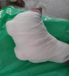 The Mandakini offloading system is also discussed in Indian literature as an effective and cost-effective offloading technique. First, a pair of gloves is rolled together. The number of gloves used is dependent on the patient size. The gloves are then placed in an adhesive dynoplast, which is then applied to the foot. For distal lesions, it is applied proximally, and for rearfoot lesions, it is applied distal to the lesion. The device is then secured with a dressing. This technique is recommended to be changed every week for 4-6 weeks and authors noted complete healing without patient complaints with over 2 years of regular uses of the technique.7