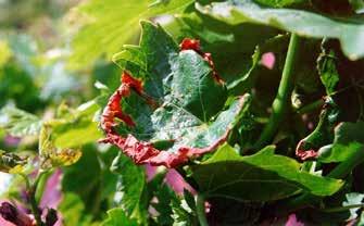 • Leaves, including leaf veins become discoloured and blotched. In red grape varieties, leaves appear red while in white varieties, leaves and veins appear chlorotic (yellow) and necrotic (dead).