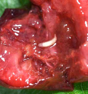 • Infested fruit show small scars and indented soft spots on the surface, left by the ‘stinging’ (ovipositing) females. Larval feeding results in the fruit collapsing around the feeding site. If the attack rates are high by SWD, the entire fruit can collapse. The oviposition scar also exposes the fruit to secondary attack by pathogens and other insects.