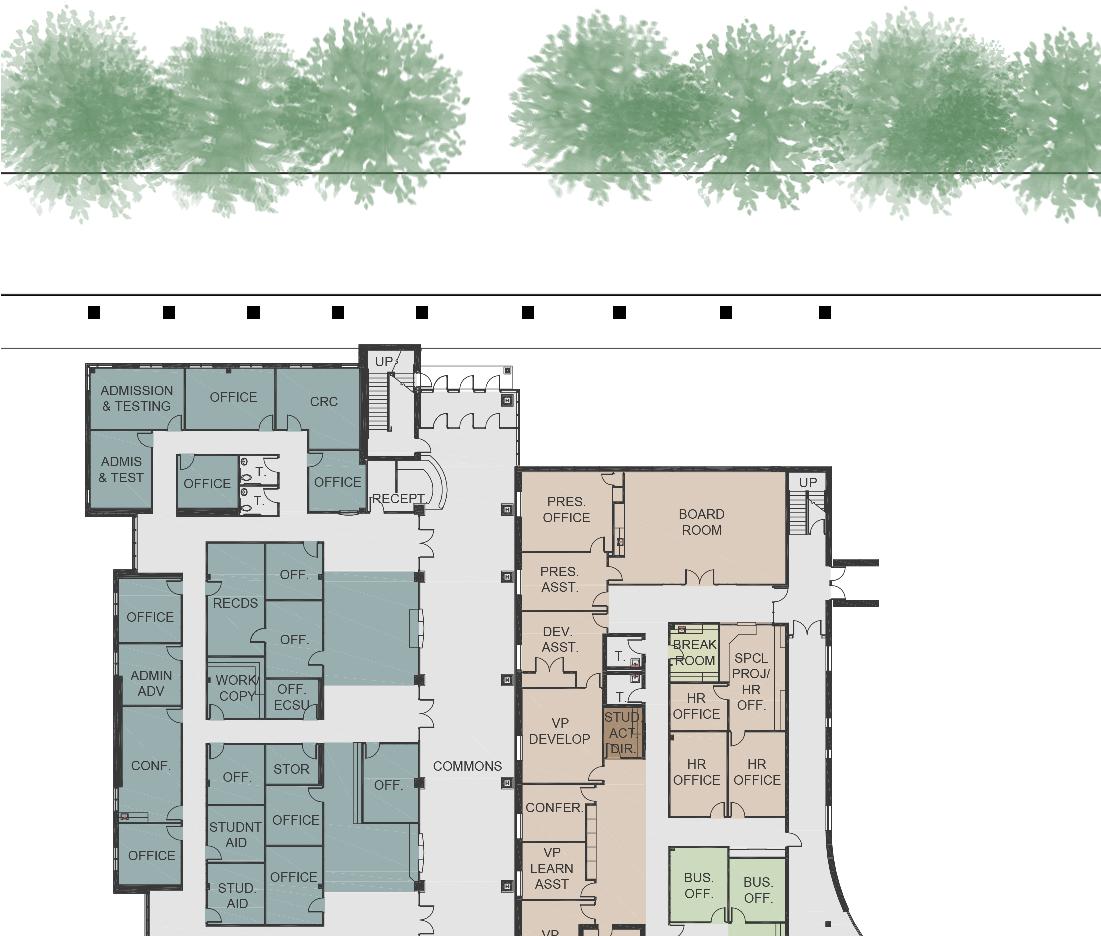• Building AE should be reinforced as the “One Front Door” to campus and a first stop housing the primary administrative functions of the campus.