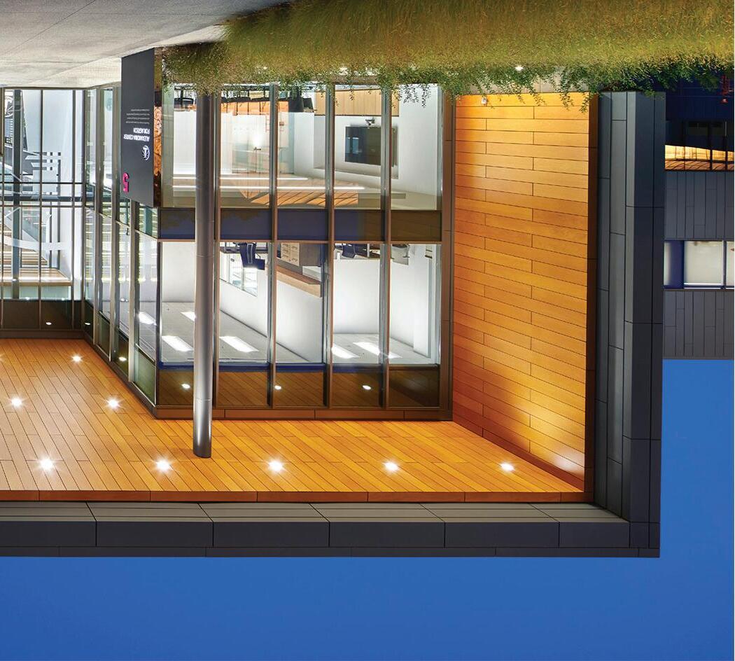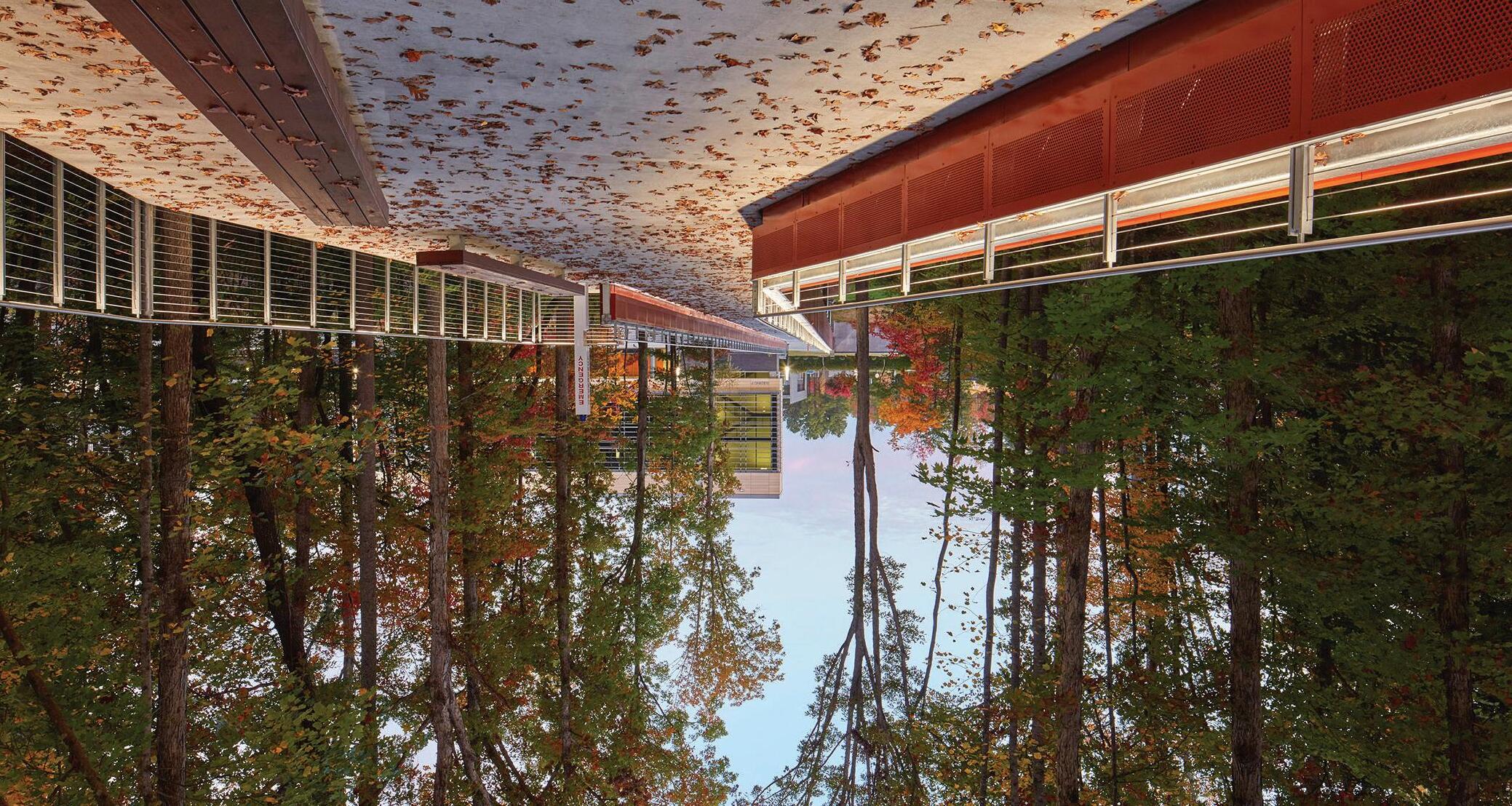 In order to connect the two parking decks on the south side of the campus to the the heart of the campus, we designed two pedestrian bridges that cut through the woods while minimally disturbing the natural forest and preserving it’s natural beauty. The two bridges end at the Building F outdoor plaza, which serves as an outdoor classroom and as a campus hangout with views into nature.