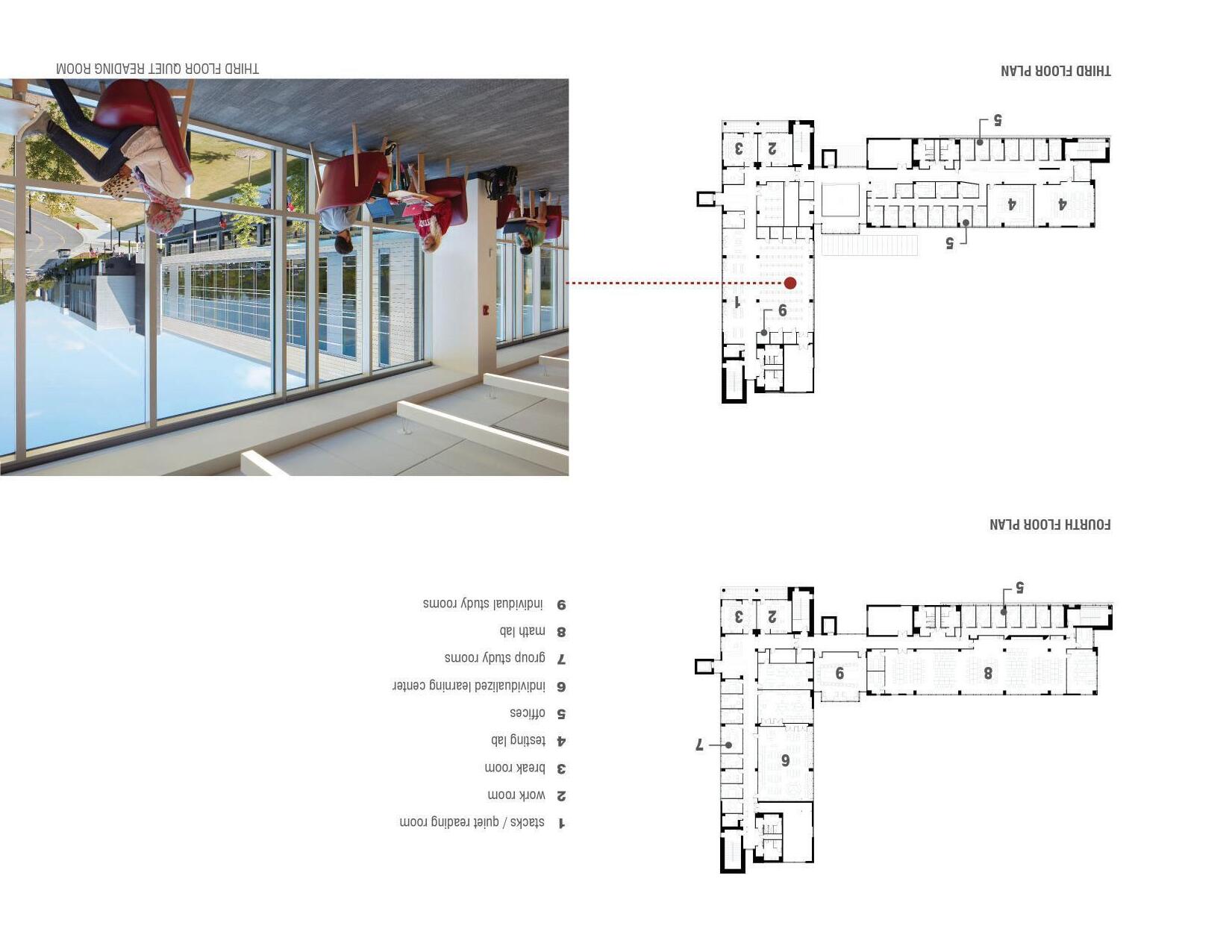 The project seeks to embrace the unique site as inspiration for the building and landscape design. The building’s form is derived from how public space engages the students with the forest and land from different locations. On the ground floor, the principal public spaces are located where the two public paths meet, forming a series of interlocking interior and exterior gathering spaces. The main public space is a double-height transparent lobby that serves as a threshold between the academic campus and natural, forested setting. The campus path continues through the lobby and extends onto an outdoor terrace, allowing students multiple opportunities to interact, play and study while enjoying views of the meadow grasses and forest floor.
