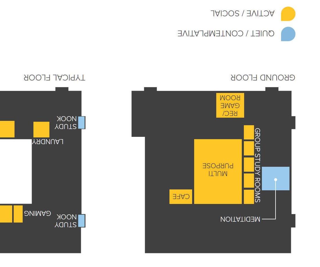 The ground floor consists of a lobby, mechanical and storage space, and a large open-air drill pad where cadets learn formations and perform fitness exercises. The upper floors zcontain study and common spaces, offices, and all of the dorm rooms around the perimeter.