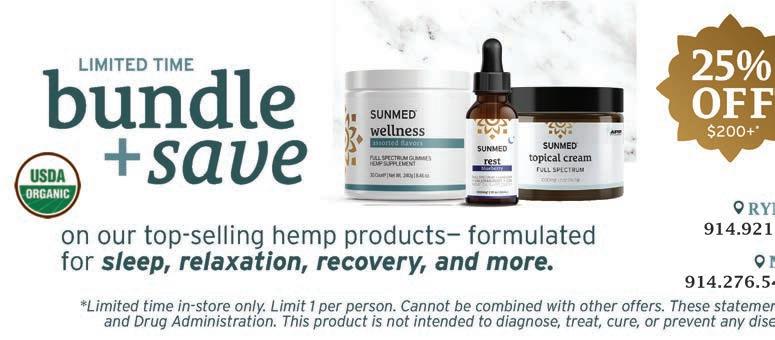 When asked what prompted her to open the business, Parlitsis shared that she was su ering from arthritis and had tried many things, including CBD, but nothing seemed to help until she used SunMed CBD, carried exclusively in Your CBD Stores. “Unfortunately, it wasn’t available in Westchester, so I went to Connecticut, and within a week of using it, it changed my life,” she recalls. “I felt it was a moral obligation to bring it to Westchester.”