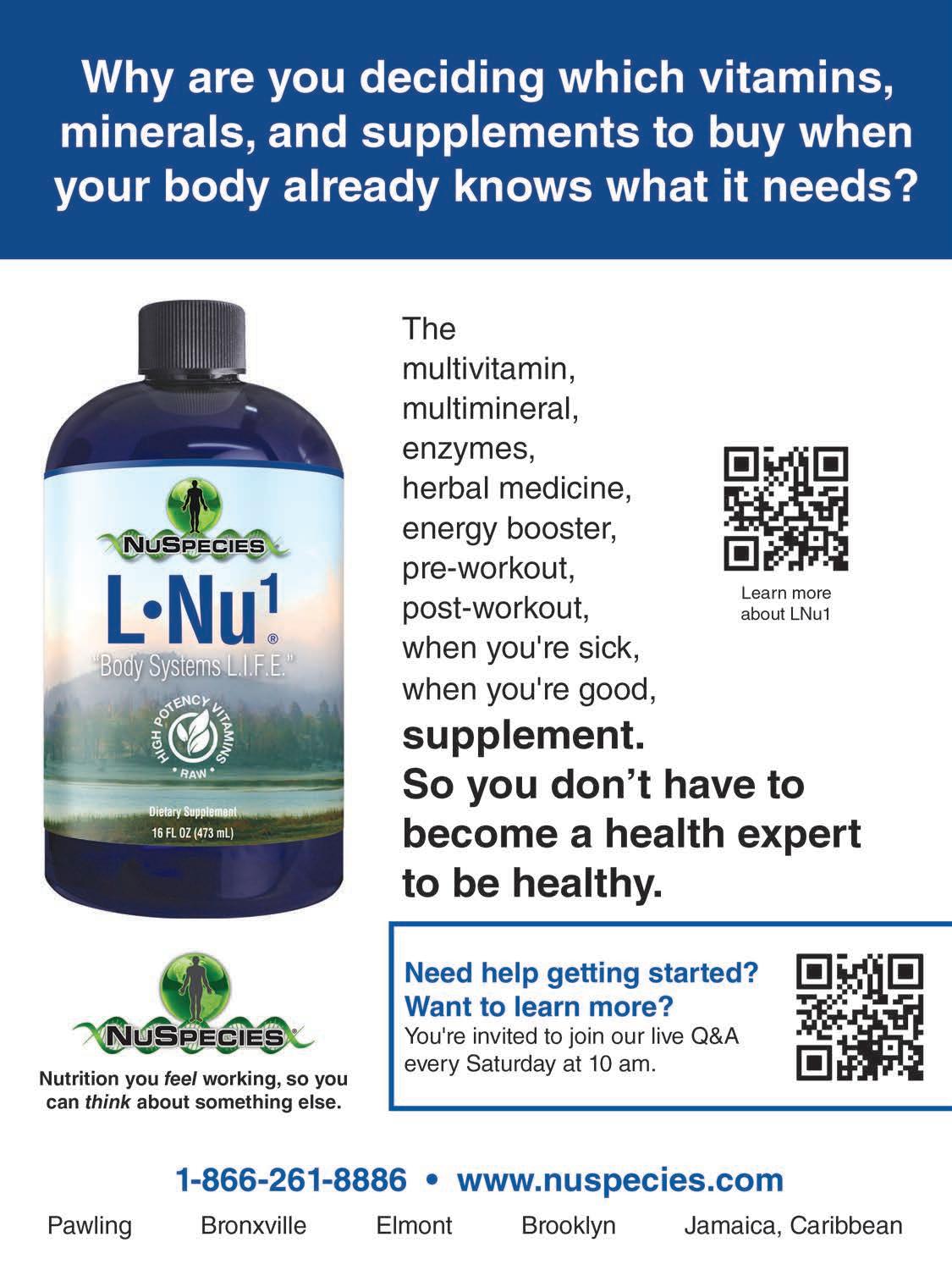 NuSpecies Health Centers provide free health consultations with certified nutri tionists life coaches. We make custom recommendations of our raw, organic, liquid, natural nutritional formulas and then work with our clients until they achieve their health goals. See ad, page 2.