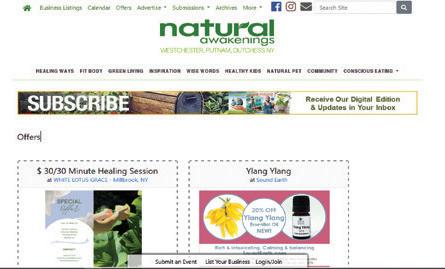 6 Westchester/Putnam/Dutchess NY Edition WakeUpNaturally.com ONLINE EXCLUSIVES VISIT US AT WakeUpNaturally.com Find additional articles online at WakeUpNaturally.com. Go to the homepage and explore local businesses and events, recipes and articles exclusively from Natural Awakenings. HEALTHY LIVING | HEALTHY PLANET FREE WORLD MEDICINE TRADITIONAL WESTCHESTER-PUTNAM-DUTCHESS NY EDITION WAKEUPNATURALLY.COM OCTOBER 2023 Visit our online calendar for more events, classes and workshops. CALENDAR COMMUNITY SPONSORS Ask us how your business can become an Online Community Sponsor. Includes a monthly online article, a featured online business listing and a featured event. Limited spots available. CLICK ON WakeUpNaturally.com Stay informed with our up-to-date articles, local event listings, special offers, insights and more! @nawestchester Natural Awakenings Westchester/Putnam NY Take advantage of EXCLUSIVE ONLINE OFFERS. FOLLOW US ON SOCIAL MEDIA SIGN UP FOR OUR EMAIL SOPHIE HARUNA KLIMCAK on Finding Awe and Wonder A SYMPHONY OF SKILL-BUILDING How Music Spurs Childhood Development HERBS FOR SINUS HEALTH RECIPE Lasagna With Tofu Ricotta and Veggie Bolognese