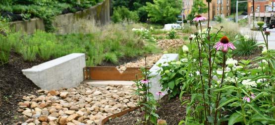 plantings and even permeable pavement parking lots. Two bioswales in Millvale help to mitigate flooding in the Girty’s Run watershed, and a bioswale and rain garden at Point State Park help manage stormwater runoff.
