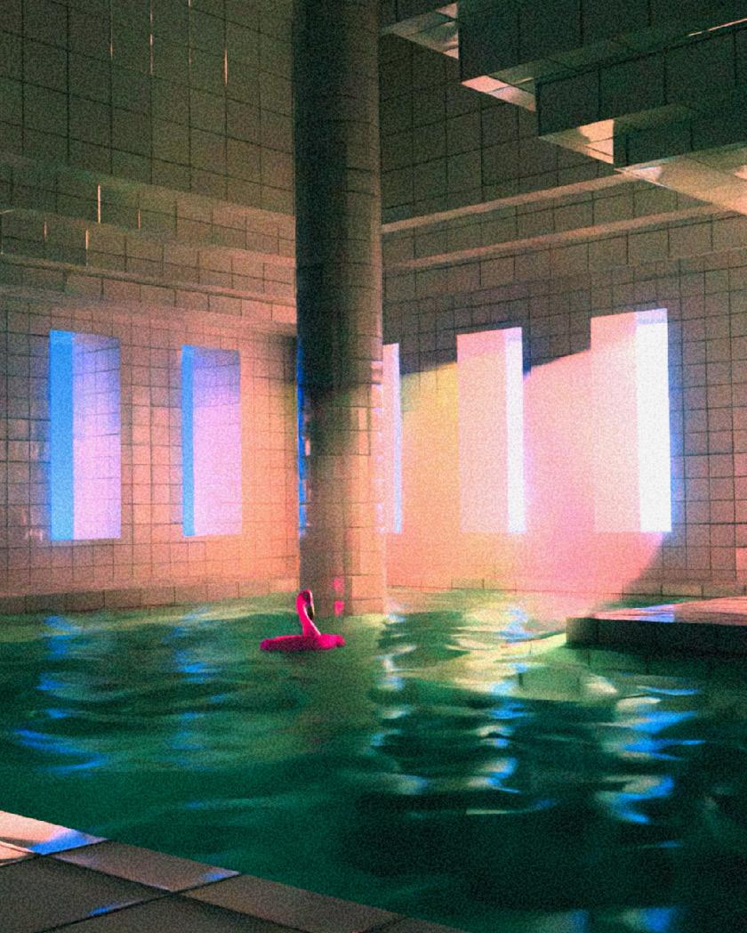 Mae pyllau nofio, tirluniau, teganau, a delweddau cyfarwydd yn ymddangos dro ar ôl tro, ond mewn mannau sy’n teimlo eu bod wedi’u gadael, wedi’u hanner goleuo, neu wedi’u rhewi mewn amser. Fflamingo pinc, pêl traeth sgleiniog, bariau llachar sgrin patrwm prawf. Mae pob un yn sefyll allan yn erbyn cefndir o dawelwch ac esgeulustod. Mae’r dŵr yn dal i ddisgleirio, ond heb neb yno, mae’r naws yn newid o chwareus i annifyr, fel petai’r rhain yn ddarnau o fyd sydd eisoes wedi gorffen gyda ffigwr yn gwylio’n dawel.