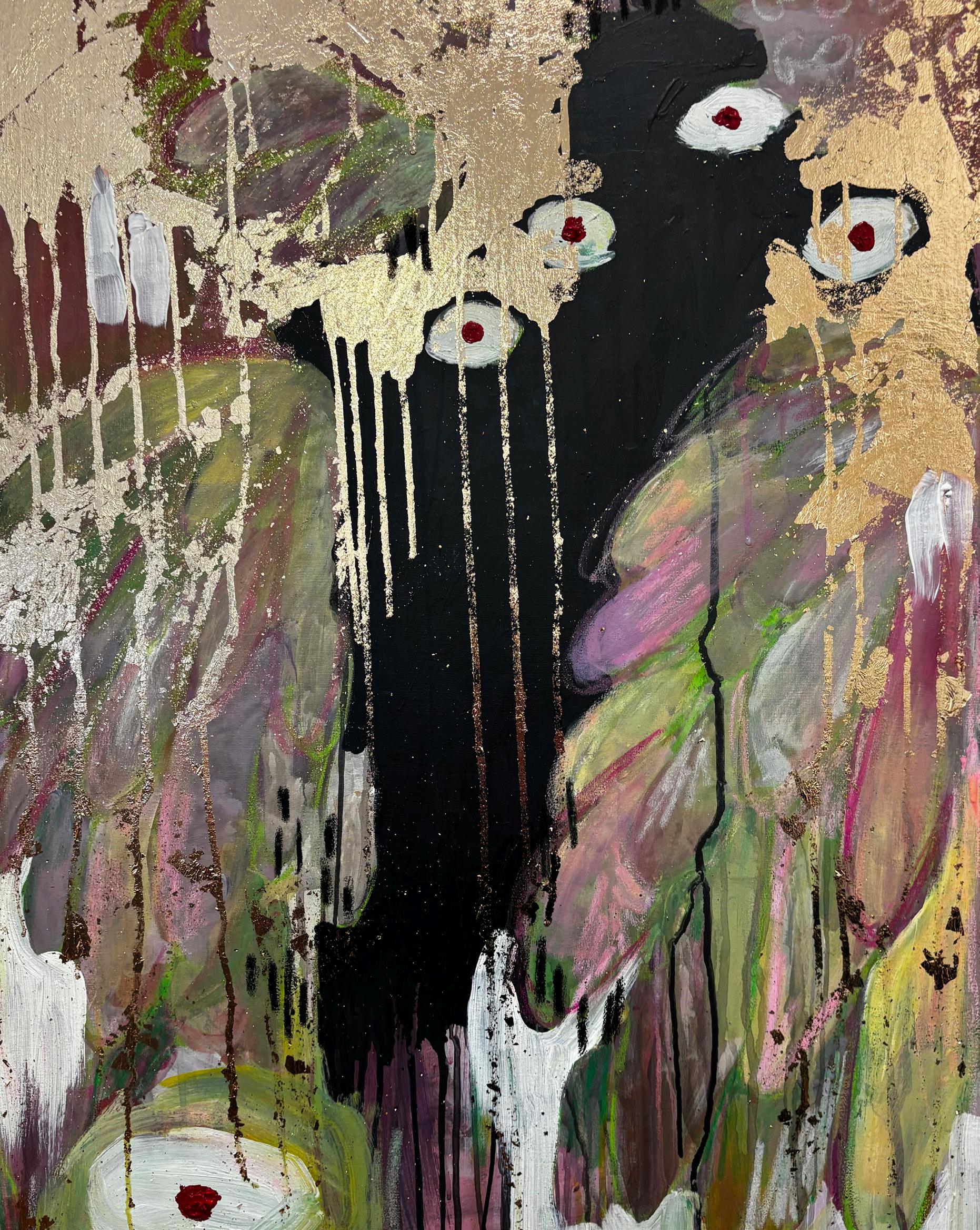 Mae’r haenu cyson o acrylig ar ben y cynfas a thynnu pob haen gyda cadachau yn fy ngalluogi i greu naratif metaphorical ar y cynfas. Mae pob gwead yn datgelu sut y gall credoau rhywiol a dylanwad crefyddol effeithio ar bob haen - bron fel pe bai’n dilyn dehongliad person o destunau crefyddol a pha mor gyflym y gall eu canfyddiad newid. Mae deilen aur, delweddau angel cwympo, a llygaid coch llachar yn ganolog i’r darn, gyda’r nod o ddangos sut mae pob symudiad yn siapio ein golwg ar gelf heddiw.