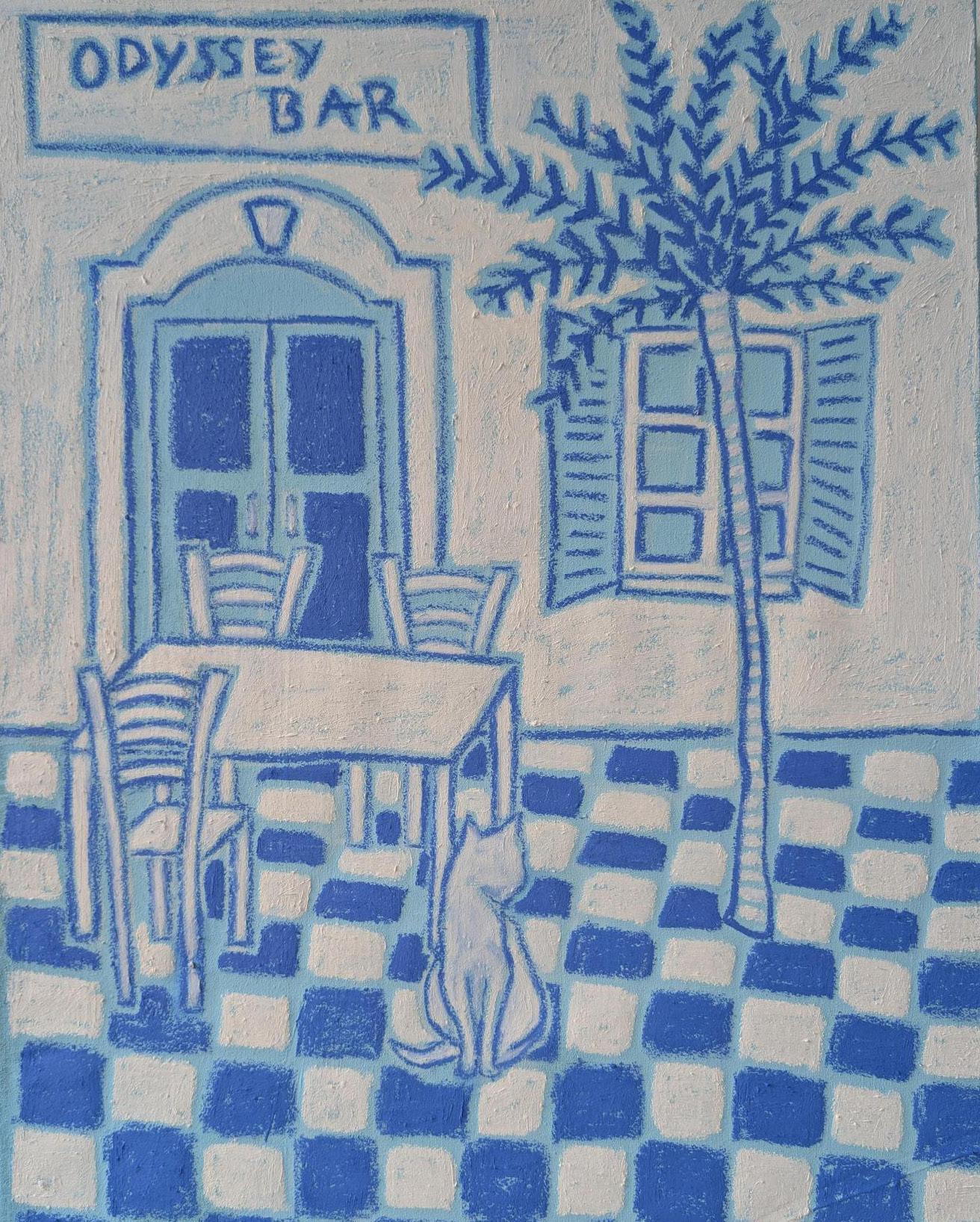Mae defnydd Eloise Hawes o las wedi’i ysbrydoli’n ddwfn gan ei theithiau i Wlad Groeg, gyda phob gwaith celf yn adlewyrchu atgofion o’r ynysoedd Rodos, Cefalonia a Chrete. Mae’r glas cyfoethog, diddiwedd hwn yn dal hanfod Môr yr Aegean eang a’r awyr agored a brofodd ar ei thaith gyntaf dramor i Rodos; taith a gafodd ddylanwad dwfn ar ei chelf. Arhosodd rhythm arafach a diwylliant hamddenol Gwlad Groeg gyda hi, gan ei hysbrydoli i gyfleu’r awyrgylch hwnnw yn ei gwaith, gan wahodd y gwyliwr i fynd ar daith weledol i ffwrdd o fywyd bob dydd.