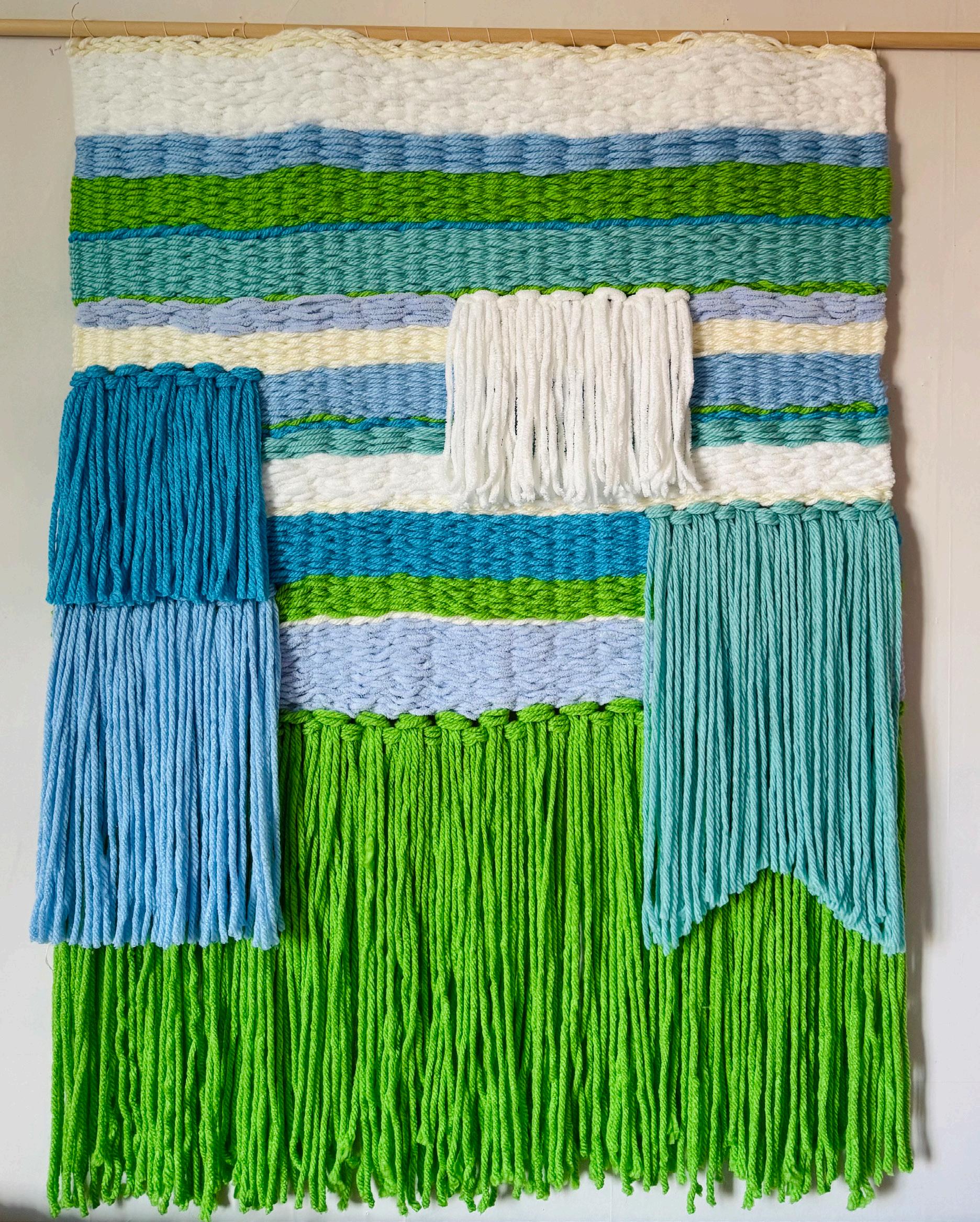 Mae’r broses o wehyddu yn araf, ailadroddus a rhythmig gyda rhinweddau sy’n gallu cynnig ymdeimlad o gysur a chydnabodrwydd. I bobl sy’n byw gyda dementia, gall ailadrodd fod yn lleddfu. Mae’n adlewyrchu’r patrymau tawel a geir mewn bywyd bob dydd, fel plygu, golchi, neu droi paned o de. Mae’r gweithredoedd bach, cyfarwydd hyn yn aml yn cynnwys ystyr dwfn, ac roeddwn i eisiau i’r gwehyddu adlewyrchu hynny. I mi, mae’r weithred o wehyddu yn dod yn ffordd o gysylltu â mi fy hun, â’r deunyddiau, a’r bobl rydw i’n ei wneud ar eu cyfer. Mae’r gwaith hwn yn rhan o brosiect ehangach sy’n edrych ar sut y gall ymarfer creadigol gefnogi lles, cyfathrebu a chysylltiad i bobl sy’n byw gyda dementia. Fel rhan o fy ngwaith gwirfoddoli gyda Thîm Ymyl Gofal Cyngor Sir Ddinbych, Red Robin yn ysbyty GIG Gogledd Cymru, Ysbyty Glan Clwyd a Chynllun Hamdden Sir Ddinbych sy’n cysgodi. Mae gen i ddiddordeb arbennig mewn sut y gall ymgysylltiad synhwyraidd, yn enwedig trwy liw a gwead, sbarduno eiliadau o bresenoldeb, rhyngweithio a mynegiant – rhywbeth y tu hwnt i eiriau.