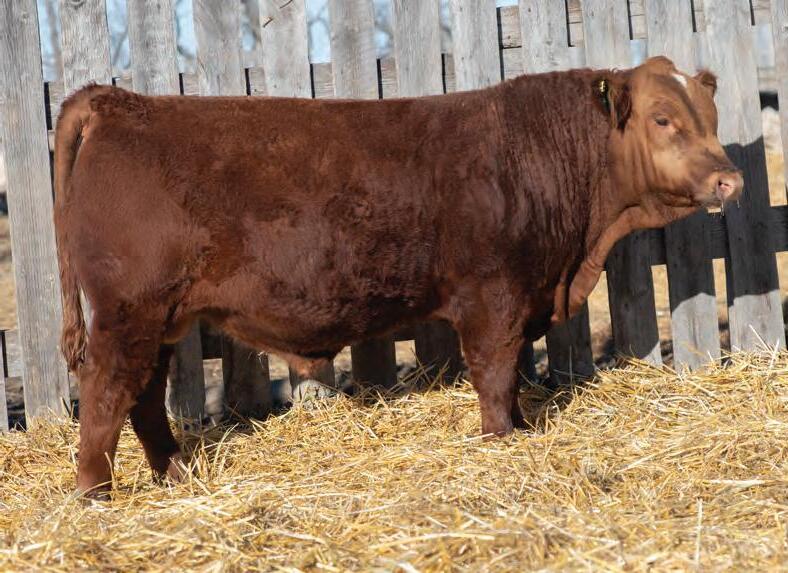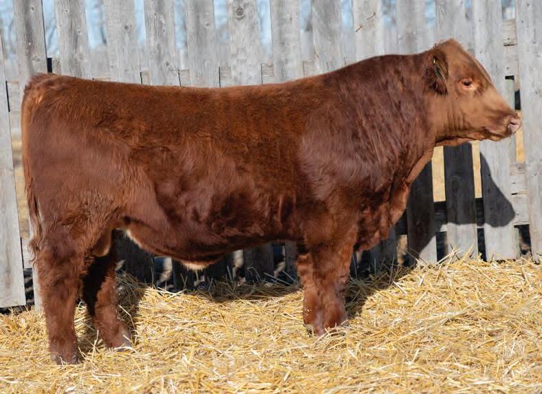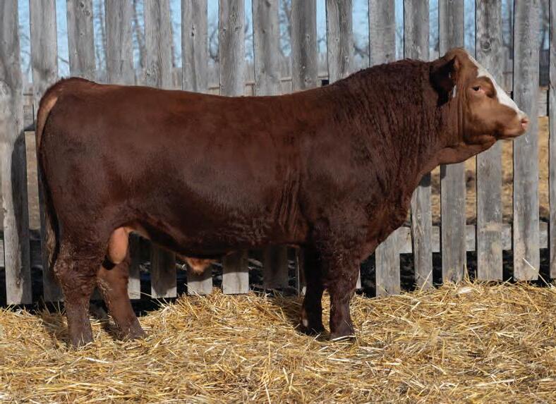 This home raised bull has really impressed us and we simply had to keep him for ourselves. Bash (and yes there is a story) is sired by the 2018 CWA Grand Champion Simmental Bull, Swan Lake Red Circuit 28D. We were pleased to be able to walk 28D for a breeding season here and he left us some wonderful calves. 178H’s deep red color and excellent foot made him an easy decision to breed him to some commercial cows. If you like the “meat and potatoes” type of bull here he is!