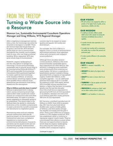 Turning a Waste Source into a Resource Shannon Lux, Sustainable Environmental Consultants Operations Manager and Greg Williams, WTS Regional Manager After a vegetation management service trims a tree, the trimmings can either be recycled or dumped in a landfill. There are various ways that wood chips can be given a second life. WTS donates wood chips for use in communities throughout the country, such as parks, trails or zoos, who use chips as animal bedding. When requested, WTS also gives wood chips to homeowners. However, organic landscaping is not the only option to salvage tree trimmings. A more environmentally sustainable way to recycle wood chips is by manufacturing Filtrexx® SiltSoxx™. WTS and Sustainable Environmental Consultants (SEC) partnered together to create a path for tree trimmings to be reused as SiltSoxx, an erosion control device, diverting organic matter from landfills which reduces those greenhouse gas emissions from being related into the atmosphere. What is SiltSoxx and why does it matter? SiltSoxx is generated from a tubular nylon casing containing wood chips used to filter water runoff and control erosion on construction sites and other disturbed areas. It’s used in locations where vegetation is ultimately going to be established. The wood chips in the SiltSoxx have the ability to chemically bind some of the invisible contaminants in water and slow the runoff to minimize soil disturbance as vegetation grows. Maintaining water and soil integrity around construction sites has farreaching impact on the environment. Construction sites have compliance regulations to minimize the environmental disturbance of projects and fines can be issued if sites are not maintained properly. Sedimentation of waterways is a large environmental