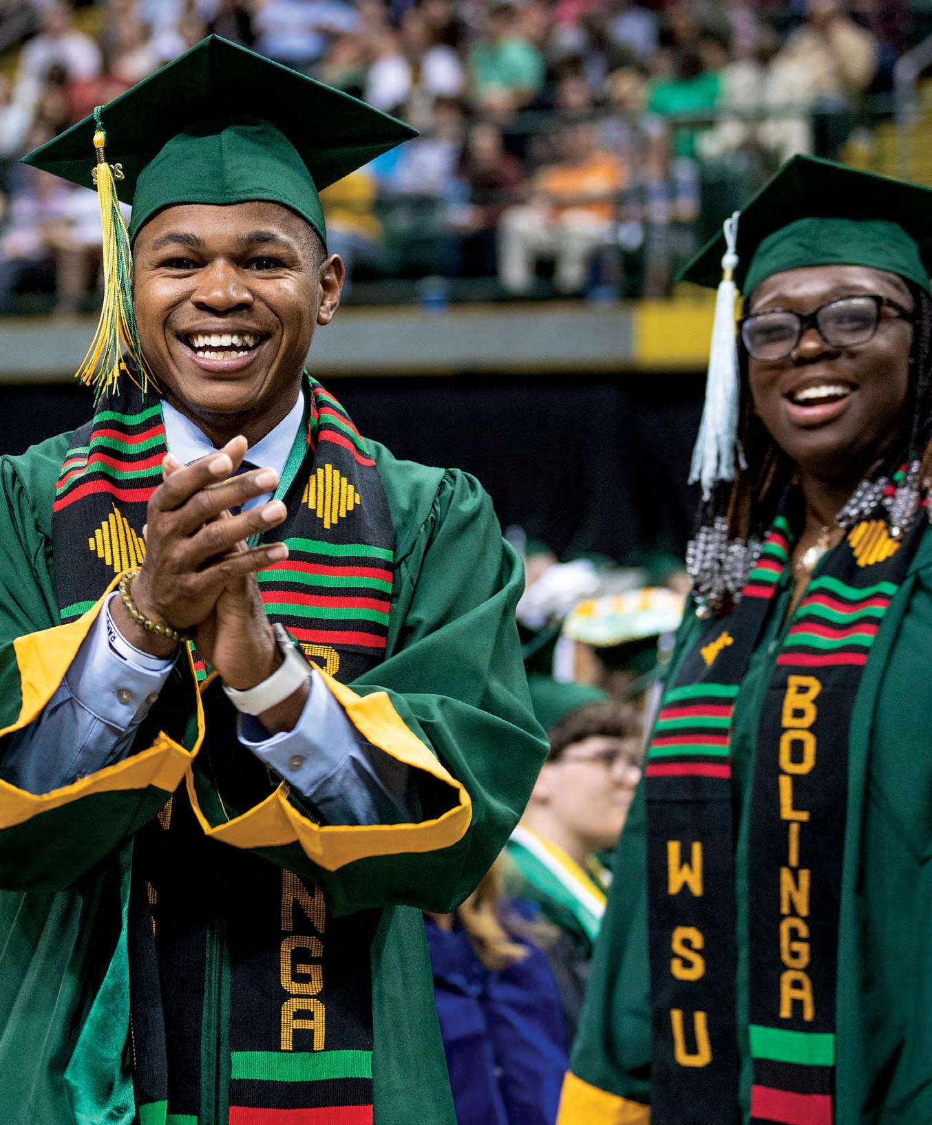 Graduates were all smiles during our 2022 Spring Commencement Ceremony. As graduation approaches, graduating seniors not only prepare for finals, but also decide how they will decorate their caps and which sashes, stoles, and cords they will don for the event. Here, two recent alumni proudly display their Wright State Bolinga Black Cultural Resources Center Kente stoles and other graduation regalia while celebrating their own and their classmates’ accomplishments.