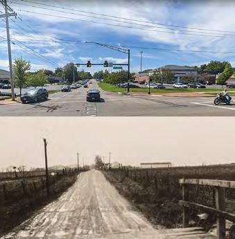 LEFT: WHIPP ROAD AT LEBANON PIKE (FAR HILLS AVENUE), LOOKING WEST, SHOWN IN GOOGLE MAPS TODAY (TOP) AND IN 1923.