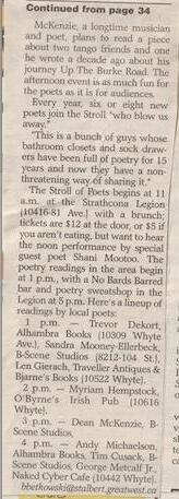 The third annual Calgary Stroll of Poets occurred on June 2nd in restaurants and bookstores along 17th Avenue once again.