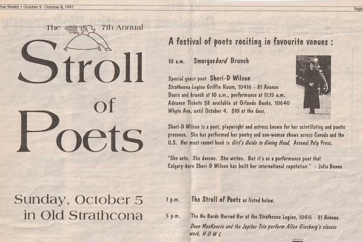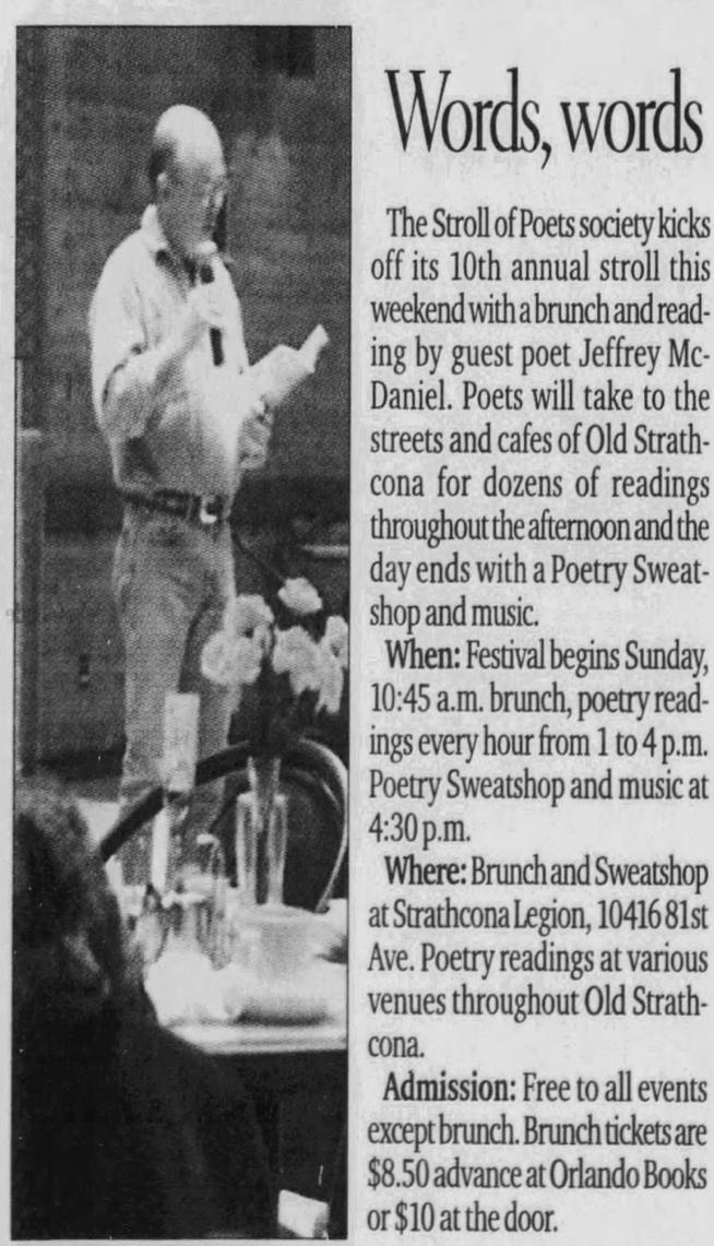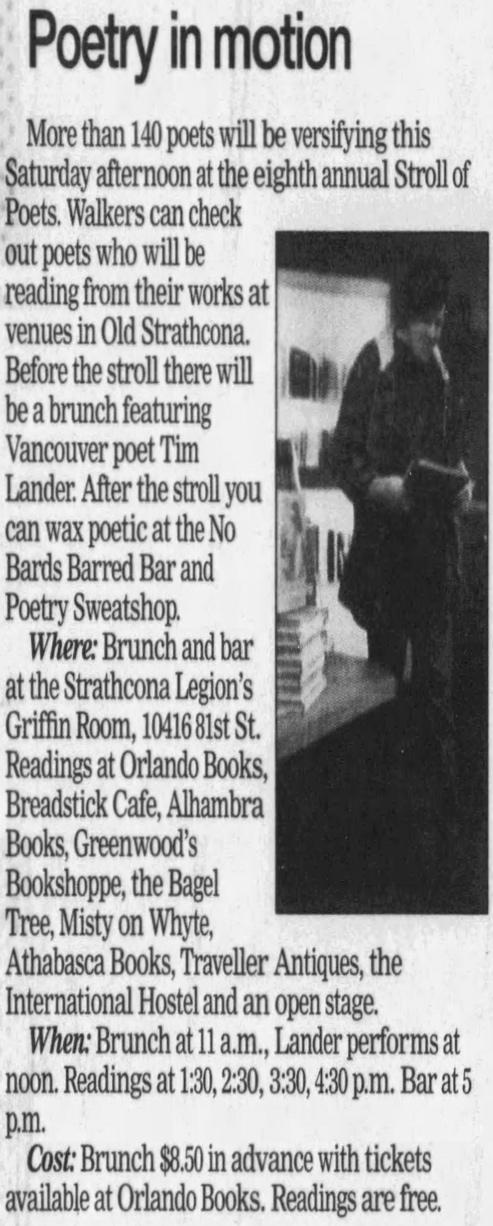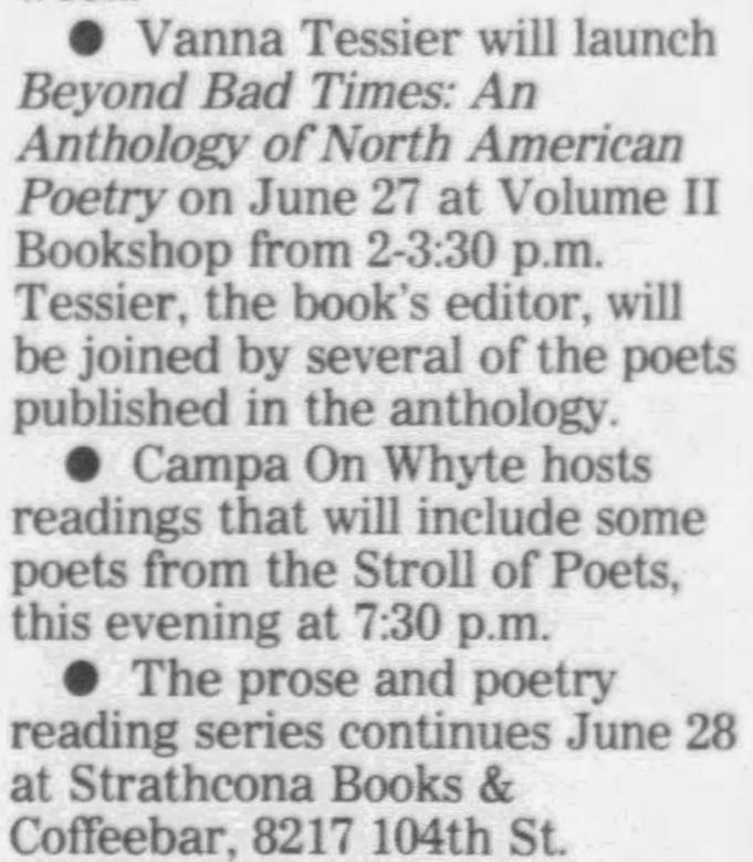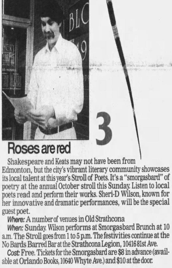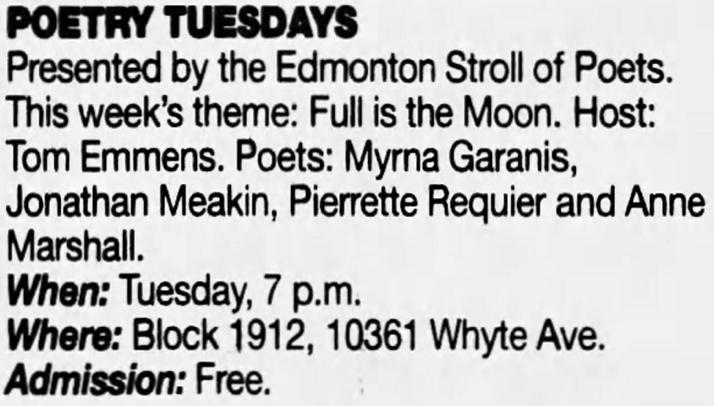 So it began, with the Stroll holding readings monthly until June in 1991 at first, and then the first Stroll event on Whyte Avenue, based on the concept of the Gallery Walk, moving from venue to venue in October. A group of 65 poets travelled and read at locations starting from Bjanre’s Books and moving westward to Café Mosaics, then Grabba Jabba, Athabasca Books, Afterwords Books, Aspen Books, common Woman Books, Varscona Books, Blue Nile Restaurant, and ending at Edmonton Bookstore. That was followed by a television recording of poetry reading from Athabasca Books in November and then the first Twelve Days of Poetry began on December 17th at The Upper Crust Restaurant to finish off that inaugural year. The exceptional