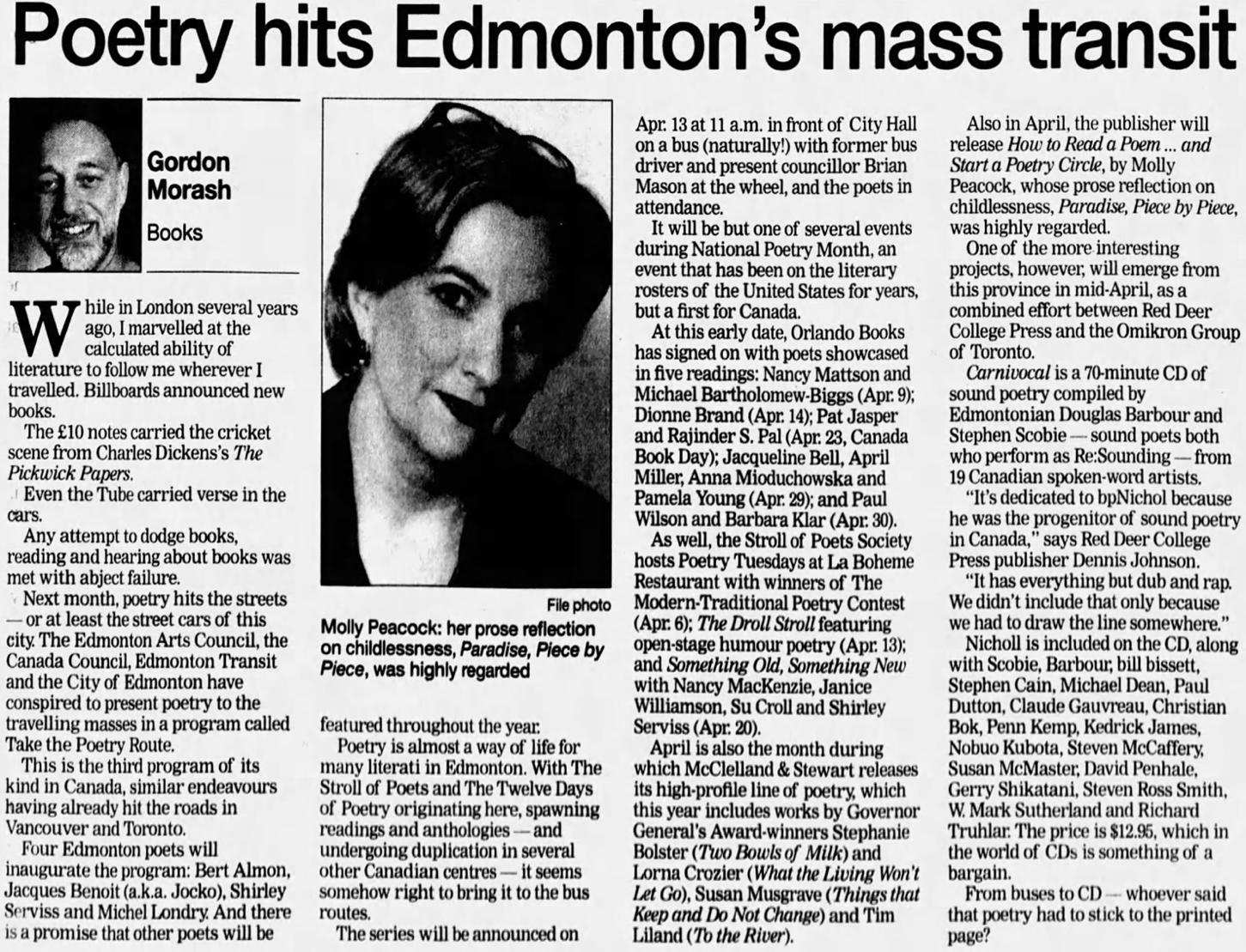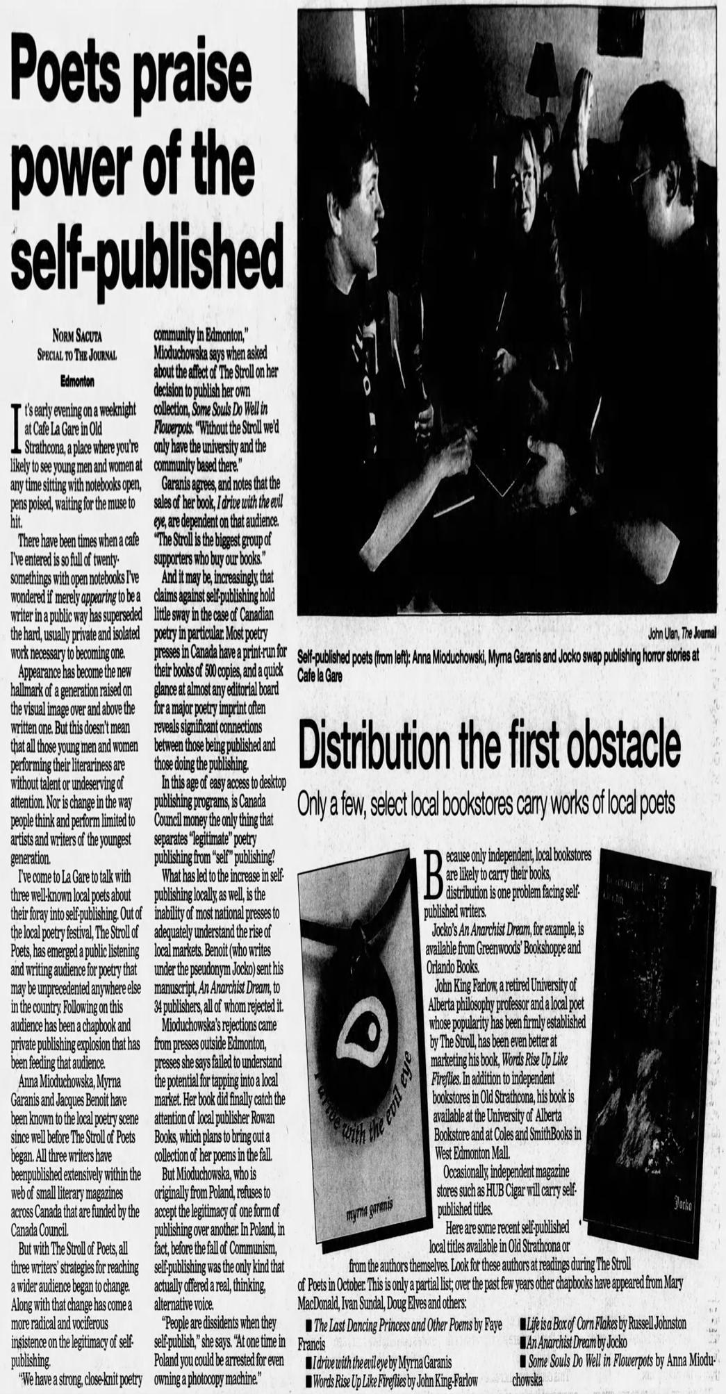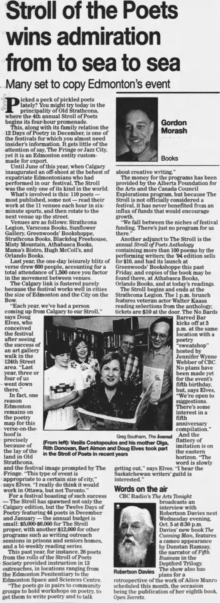 So it began, with the Stroll holding readings monthly until June in 1991 at first, and then the first Stroll event on Whyte Avenue, based on the concept of the Gallery Walk, moving from venue to venue in October. A group of 65 poets travelled and read at locations starting from Bjanre’s Books and moving westward to Café Mosaics, then Grabba Jabba, Athabasca Books, Afterwords Books, Aspen Books, common Woman Books, Varscona Books, Blue Nile Restaurant, and ending at Edmonton Bookstore. That was followed by a television recording of poetry reading from Athabasca Books in November and then the first Twelve Days of Poetry began on December 17th at The Upper Crust Restaurant to finish off that inaugural year. The exceptional