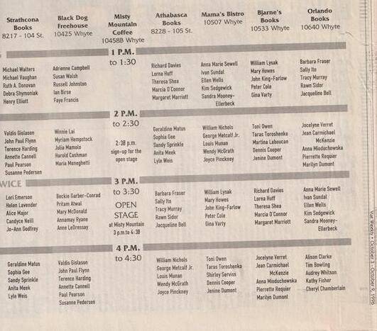 Must poetry accept its status of pauper of the arts? What could be done to give it the weight of public acceptance, and hence an ever-expanding importance? The Fringe brought new audiences to live theatre, and the Gallery Walk drew new patrons into art galleries. But how to do the same for poetry . . . ? I mulled over these questions when chatting with Lori White, proprietor of Afterwords, a second-hand bookshop on Whyte Avenue (long since gone). But of course: there are several venues on Whyte which could lend themselves well to poetry readings: bookshops and bistros. Do it all on the same day: it becomes an ‘event” then. Lori was intrigued and volunteered her shop. I went around the corner to speak to Margo Cross of Athabasca Books, and she began her long enthusiasm for our event. Down the street to Bjarne’s Books. Bjarne Tokrud liked the idea. At that point I knew it could fly. I called Ivan Sundal, and his enthusiasm told me that poets would go for it. He and I convened a meeting on August 23, 1991.