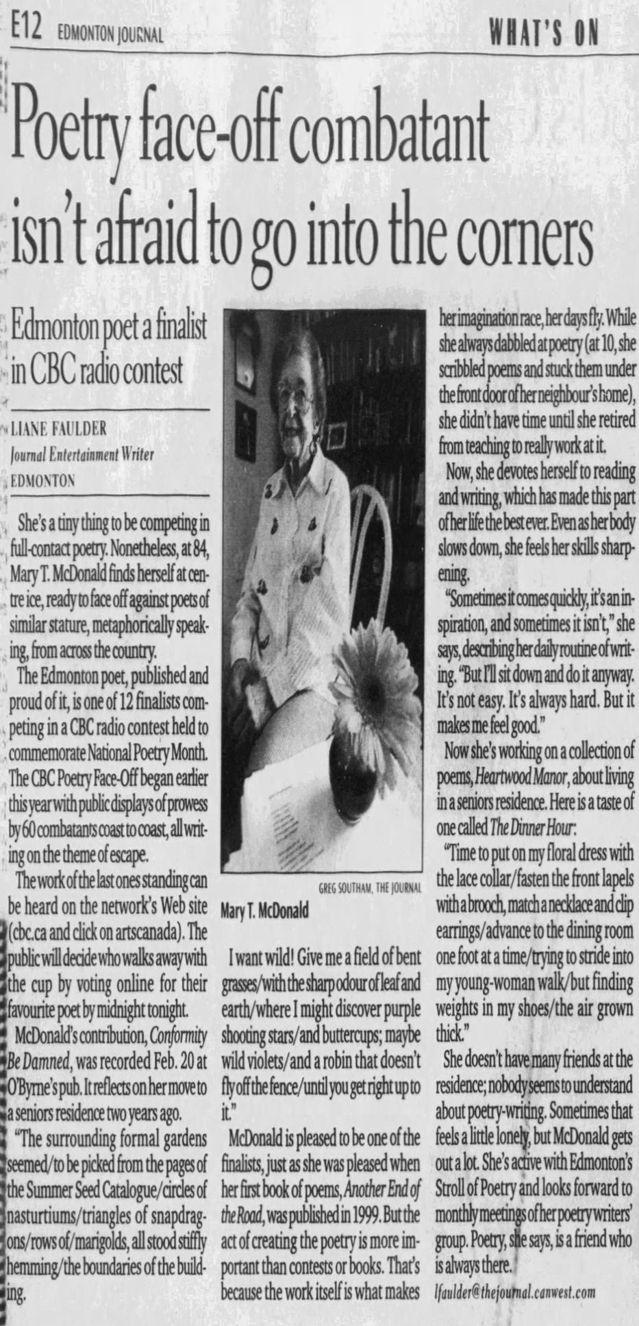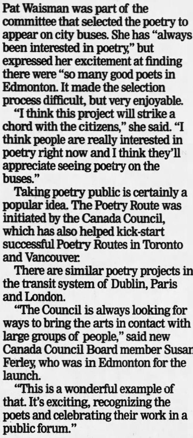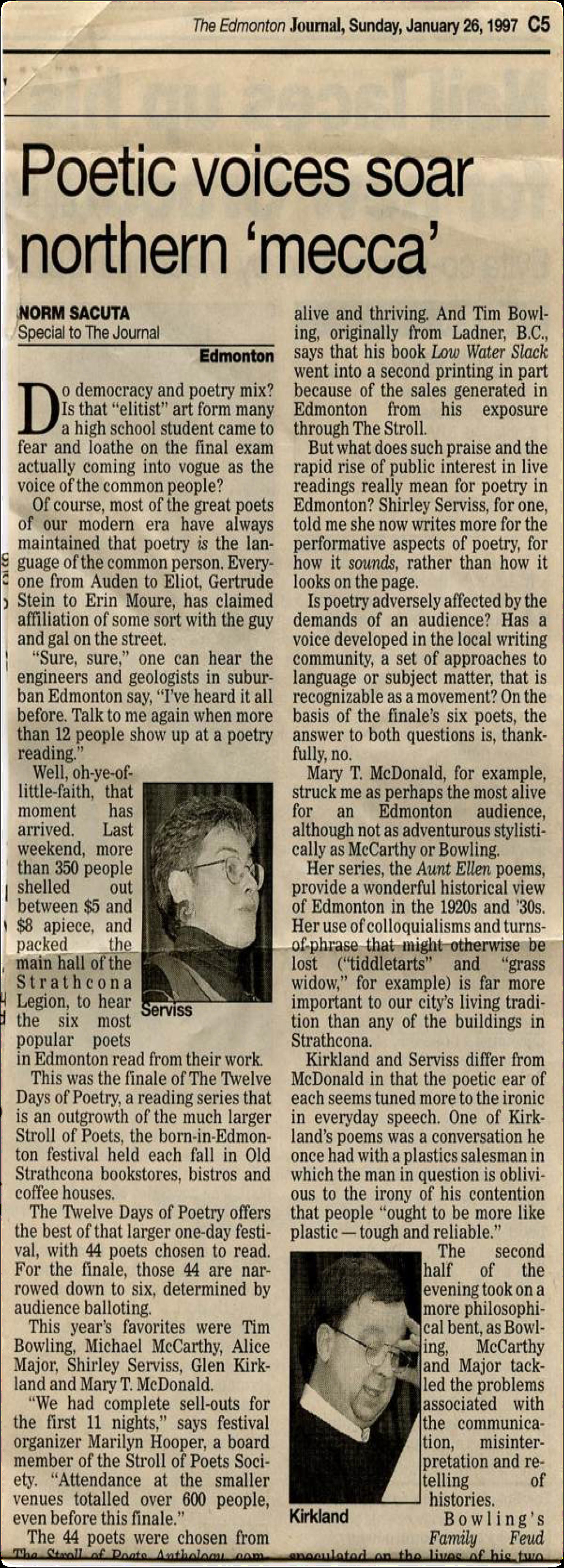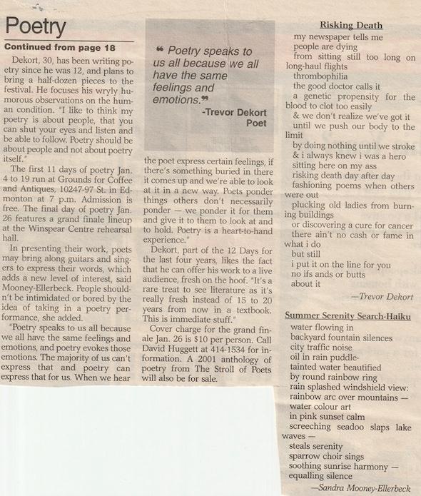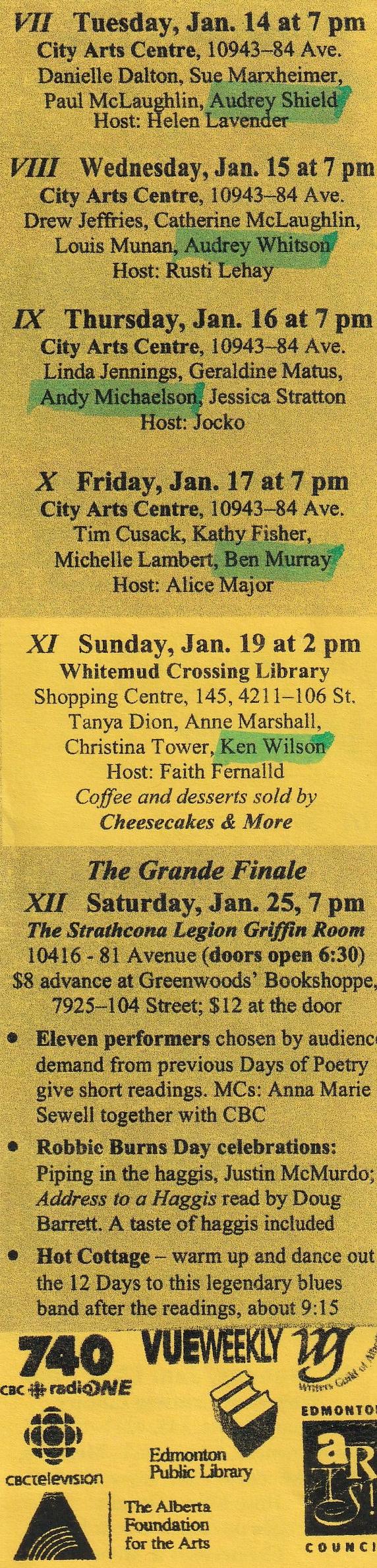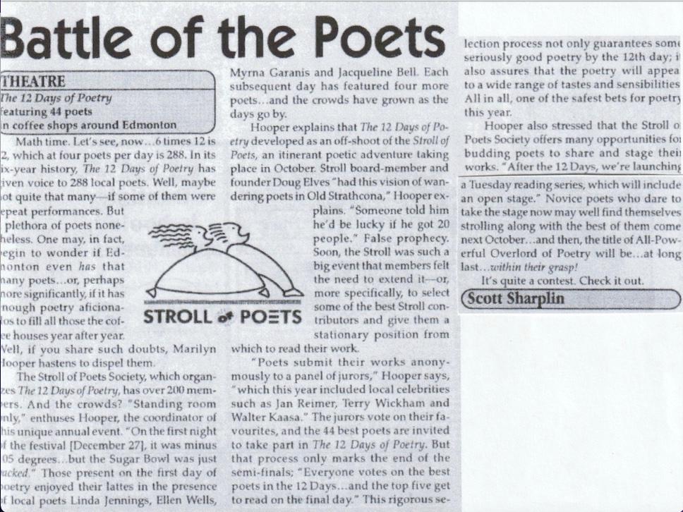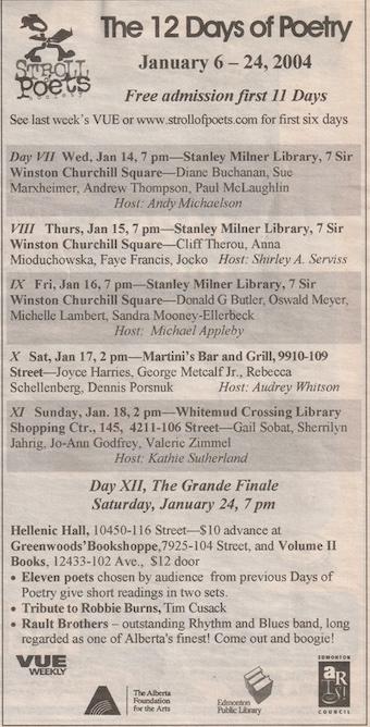 The fourth edition of the Twelve Days of Poetry was run through the month of January and was considered another smashing success. It was becoming a recognized and ever more appreciated event and was well covered by the Edmonton press.