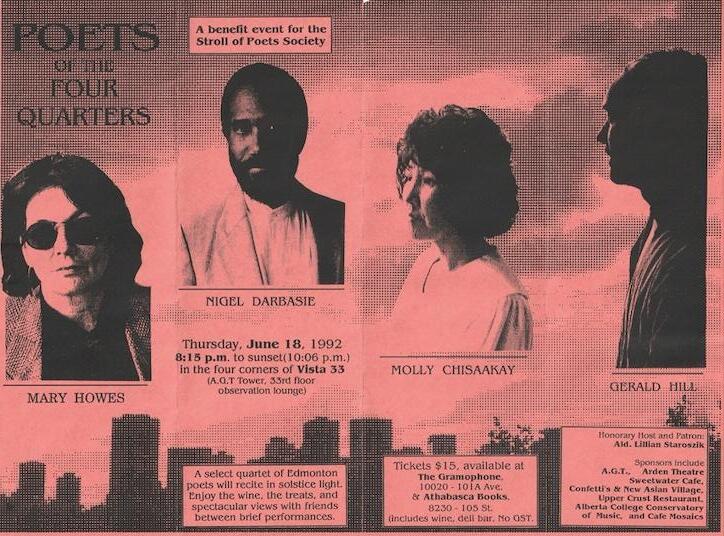 The first Annual General Meeting was held in March of 1992 and Ivan Sundal was elected as the first President of the Stroll of Poets Society. The annual membership fee was set at $5.00. The initial board meetings were conducted in the Mezzanine Meeting Room of the Renford Inn on Whyte. One of the first events organized by the Stroll of Poets was a benefit event held in Vista 33 observation lounge, on the 33rd floor of the A.G.T. Tower, on June 18th. Called “Poets of the Four Quarters, it featured Mary Howes, Nigel Darbasie, Molly Chisaakay, and Gerald Hill, four Edmonton poets, reciting in the four corners of the lounge area. It was hosted by Alderwoman Lillian Staroszik and sponsored by A.G.T.,Upper Crust Restaurant, Arden Theater, Sweetwater Café, Confetti’s and New Asian Village, Café Mosaics, Bullock Catering, and Alberta College Conservtory of Music.