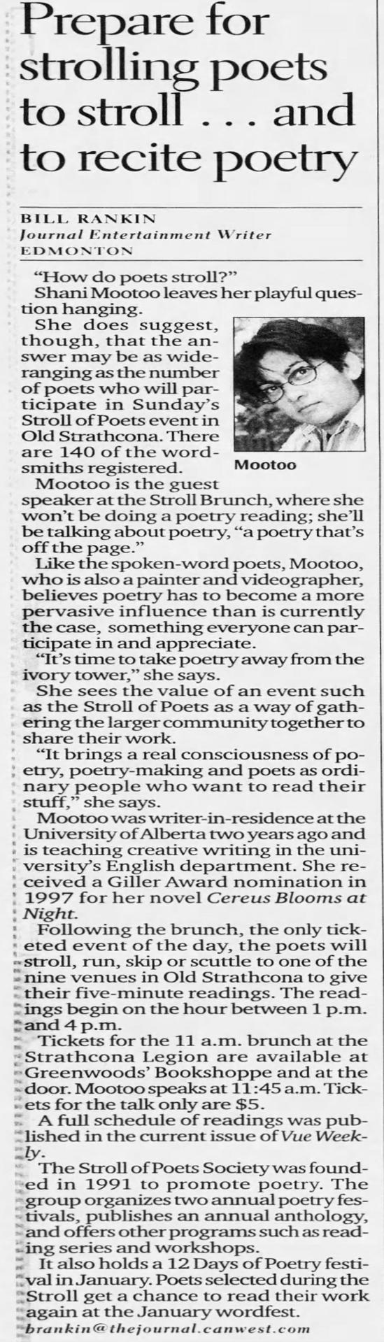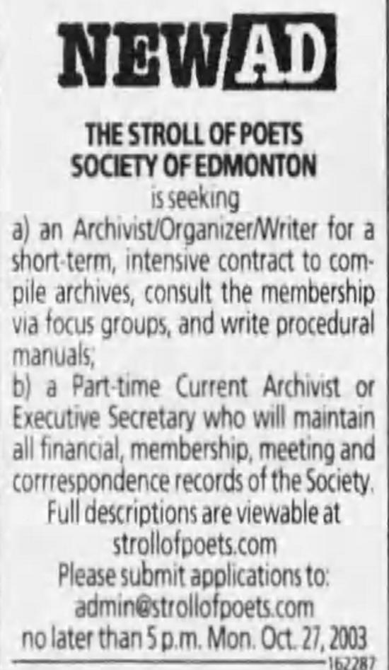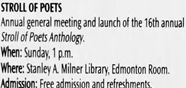 Stroll newsletters became a regular communication to members with 4 issues published during the year. The first was in March and provided sign up and submission forms for the third annual Stroll Festival and guidelines for the annual anthology. It also listed details of the upcoming AGM: $5.00 membership fees were due; submission of forms for the Stroll Festival; submission of poem and bio for the anthology; opportunity to declare a desire to participate in the 12 Days of Poetry; nominations and election of the board (recommended to elect a President, Secretary and Treasurer and a total of eight to ten members). The newsletter was issued from a new office location of 10503 – 100 Ave, Edmonton, AB, T5J 0A8.