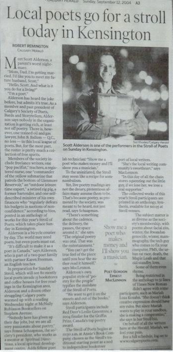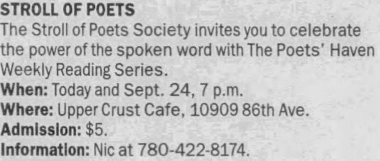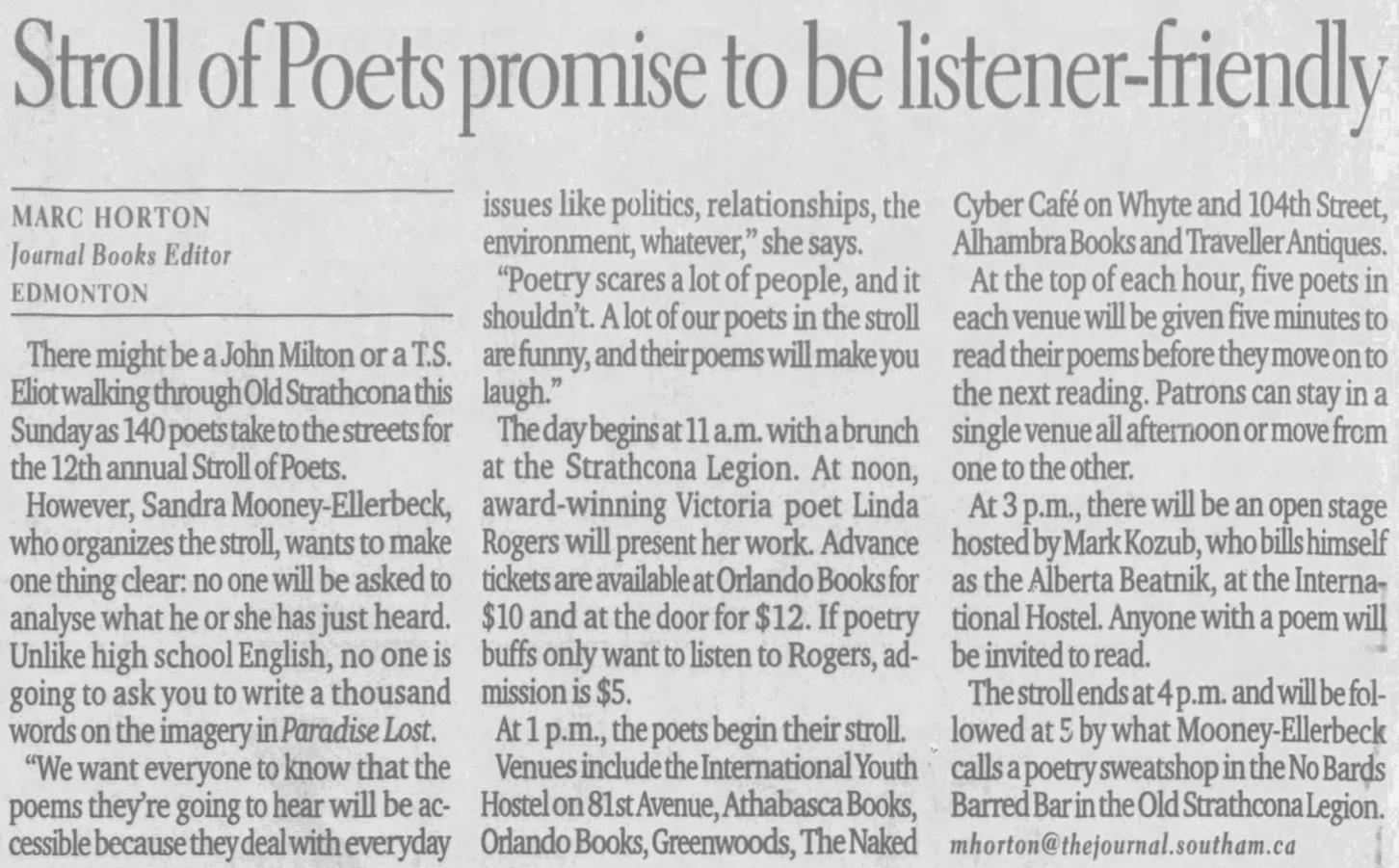 The Edmonton Stroll of Poets Society sister group, the Calgary Stroll of Poets featured over 60 poets in various venues (cafes and bookstores) along 17th Avenue on June 4th of this year.