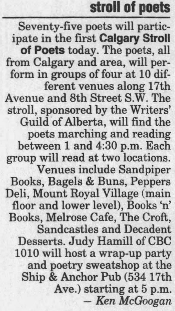 Seventy-five poets participated in the first Calgary Stroll of Poets on June 5th, sponsored by the Writer’s Guild of Alberta, along 17th Avenue. Readings took place at several venues along the strip such as Sandpiper Books, Bagels and Buns, Peppers Deli, Mount Royal Village, Books n Books, Melrose Café, The Croft, Sandcastles, and Decadent Desserts. A wrap up party, hosted by Judy Hamill of CBC1010, and poetry sweatshop concluded the day at the Ship & Anchor Pub.