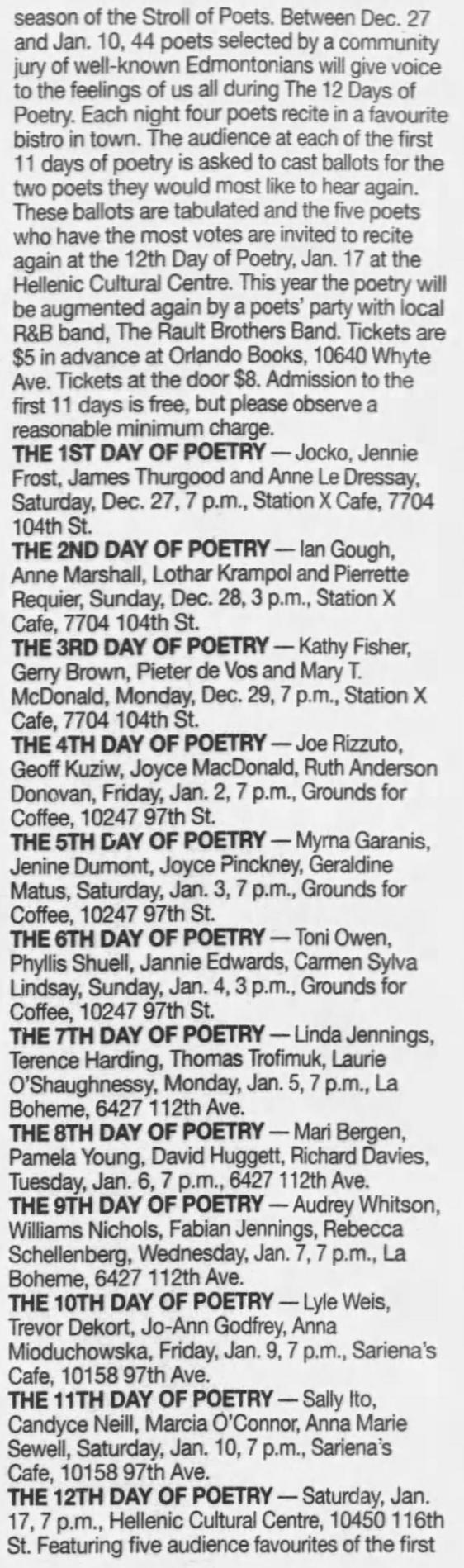 The expanding roster of poets created challenges in organizing the Twelve Days of Poetry, as well. The 1992 event was created around eleven poets chosen from the anthology by the producers of CBC Radio literary programming in Edmonton. These eleven poets were then each asked to invite three others to recite on the same evening. The CBD producers attended all eleven events, selected their favourites, and recorded these at the 12th Day of Poetry. Controversy erupted amongst the poets who had not been included, for they felt that you had to be someone’s friend to be selected. The point was valid, so the executive came up with the plan that we all know by now: blind judging by jurors drawn from the community, and so on. in retrospect we have often marvelled at how the Stroll year had become a cohesive whole. The allinclusive Stroll fed poems to the Anthology, the Anthology fed the roster into the 12 Days of Poetry, and the first eleven days created, by audience vote, the shortlist for the finale.