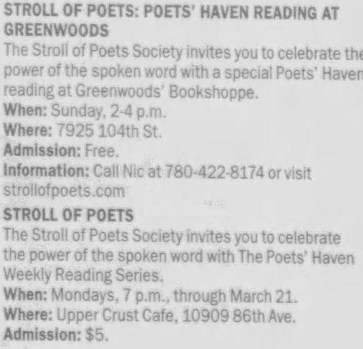 the news in the previous newsletter. The October Stroll Scroll detailed the schedule for the Festival and also included articles about the outreach program and the Thursday evening poetry live events. Those articles were also repeated in the December issue which included details of the 12 Days of Poetry event as well. It also contained a couple of advertisements resulting from work of the outreach committee. One was from the Grant McEwen Community College announcing new courses being offered in creative writing and the other was a call for 16 poets to work in community outreach workshops for an honorarium of $100 each.