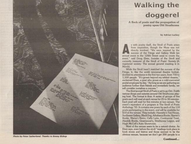 In preparation for the Stroll event leaflets were distributed by Stroll members, referred to as Poetroopers, to advertise it in advance. Opening day was deemed “Beret Day” and Don McKay, the poet in residence at the U of A and winner of the 1991 Governor General Award for Poetry, was featured at the opening brunch held at the Strathcona Legion. That year an Open Stage was managed by Andrew Thompson and the culmination of the Festival was celebrated at the No Bards Barred wrap up event. Participating poets received a $10 honorarium and an Anthology for their performance. Some repeat and many new South side venues were lined up by the busy Stroll board members that year including Sunflower Gallery, Hanratty’s Teashop, Greenwoods Books, Latte Café, The Black Dog, Athabasca Books, Mama’s Bistro, Bjarne’s Books, Continental Trust, and Hugh McColl’s.