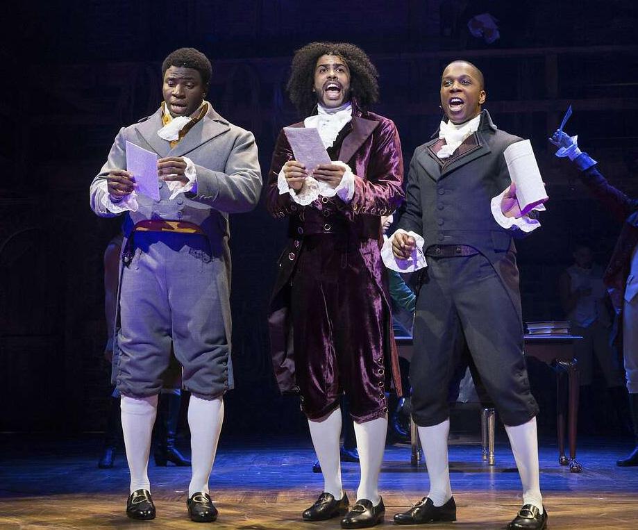 Thomas Jefferson, James Madison e Aaron Burr representados em Ha milton: Um Musical Americano.
