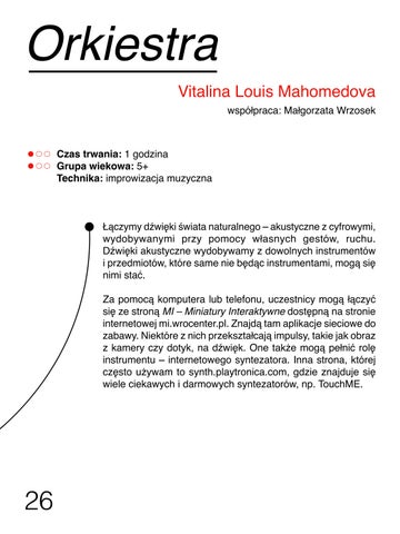 Łączymy dźwięki świata naturalnego – akustyczne z cyfrowymi, wydobywanymi przy pomocy własnych gestów, ruchu. Dźwięki akustyczne wydobywamy z dowolnych instrumentów i przedmiotów, które same nie będąc instrumentami, mogą się nimi stać. Za pomocą komputera lub telefonu, uczestnicy mogą łączyć się ze stroną MI – Miniatury Interaktywne dostępną na stronie internetowej mi.wrocenter.pl. Znajdą tam aplikacje sieciowe do zabawy. Niektóre z nich przekształcają impulsy, takie jak obraz z kamery czy dotyk, na dźwięk. One także mogą pełnić rolę instrumentu – internetowego syntezatora. Inna strona, której często używam to synth.playtronica.com, gdzie znajduje się wiele ciekawych i darmowych syntezatorów, np. TouchME.