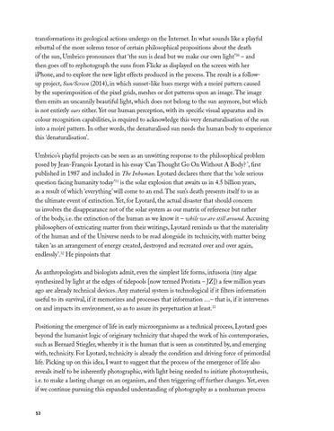transformations its geological actions undergo on the Internet. In what sounds like a playful rebuttal of the more solemn tenor of certain philosophical propositions about the death of the sun, Umbrico pronounces that ‘the sun is dead but we make our own light’30 – and then goes off to rephotograph the suns from Flickr as displayed on the screen with her iPhone, and to explore the new light effects produced in the process. The result is a followup project, Sun/Screen (2014), in which sunset-like hues merge with a moiré pattern caused by the superimposition of the pixel grids, meshes or dot patterns upon an image. The image then emits an uncannily beautiful light, which does not belong to the sun anymore, but which is not entirely ours either. Yet our human perception, with its specific visual apparatus and its colour recognition capabilities, is required to acknowledge this very denaturalisation of the sun into a moiré pattern. In other words, the denaturalised sun needs the human body to experience this ‘denaturalisation’. Umbrico’s playful projects can be seen as an unwitting response to the philosophical problem posed by Jean-François Lyotard in his essay ‘Can Thought Go On Without A Body? ’, first published in 1987 and included in The Inhuman. Lyotard declares there that the ‘sole serious question facing humanity today’31 is the solar explosion that awaits us in 4.5 billion years, as a result of which ‘everything’ will come to an end. The sun’s death presents itself to us as the ultimate event of extinction. Yet, for Lyotard, the actual disaster that should concern us involves the disappearance not of the solar system as our matrix of reference but rather of the body, i.e. the extinction of the human as we know it – while we are still around. Accusing philosophers of extricating matter from their writings, Lyotard reminds us that the materiality of the human and of the Universe needs to be read alongside its technicity, with matter being taken ‘as an arrangement of energy created, destroyed and recreated over and over again, endlessly’.32 He pinpoints that As anthropologists and biologists admit, even the simplest life forms, infusoria (tiny algae synthesized by light at the edges of tidepools [now termed Protista – JZ]) a few million years ago are already technical devices. Any material system is technological if it filters information useful to its survival, if it memorizes and processes that information …– that is, if it intervenes on and impacts its environment, so as to assure its perpetuation at least.33 Positioning the emergence of life in early microorganisms as a technical process, Lyotard goes beyond the humanist logic of originary technicity that shaped the work of his contemporaries, such as Bernard Stiegler, whereby it is the human that is seen as constituted by, and emerging with, technicity. For Lyotard, technicity is already the condition and driving force of primordial life. Picking up on this idea, I want to suggest that the process of the emergence of life also reveals itself to be inherently photographic, with light being needed to initiate photosynthesis, i.e. to make a lasting change on an organism, and then triggering off further changes. Yet, even if we continue pursuing this expanded understanding of photography as a nonhuman process 52