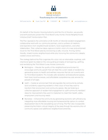 On behalf of the Houston Housing Authority and the City of Houston, we proudly and enthusiastically present the Third Ward Cuney Homes Choice Neighborhood Initiative Draft Transformation Plan.