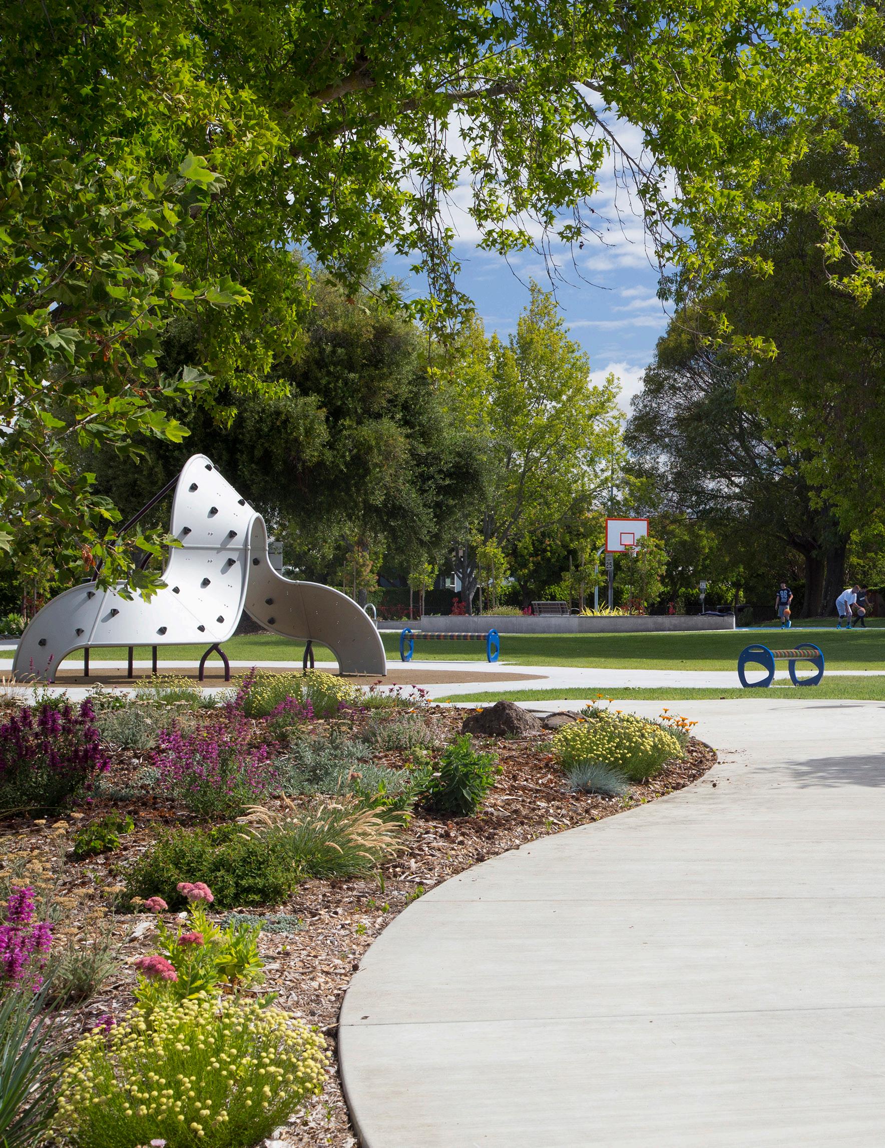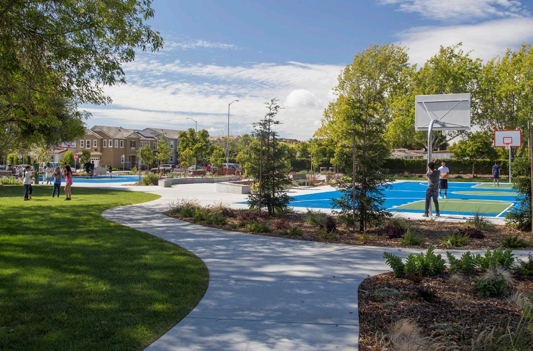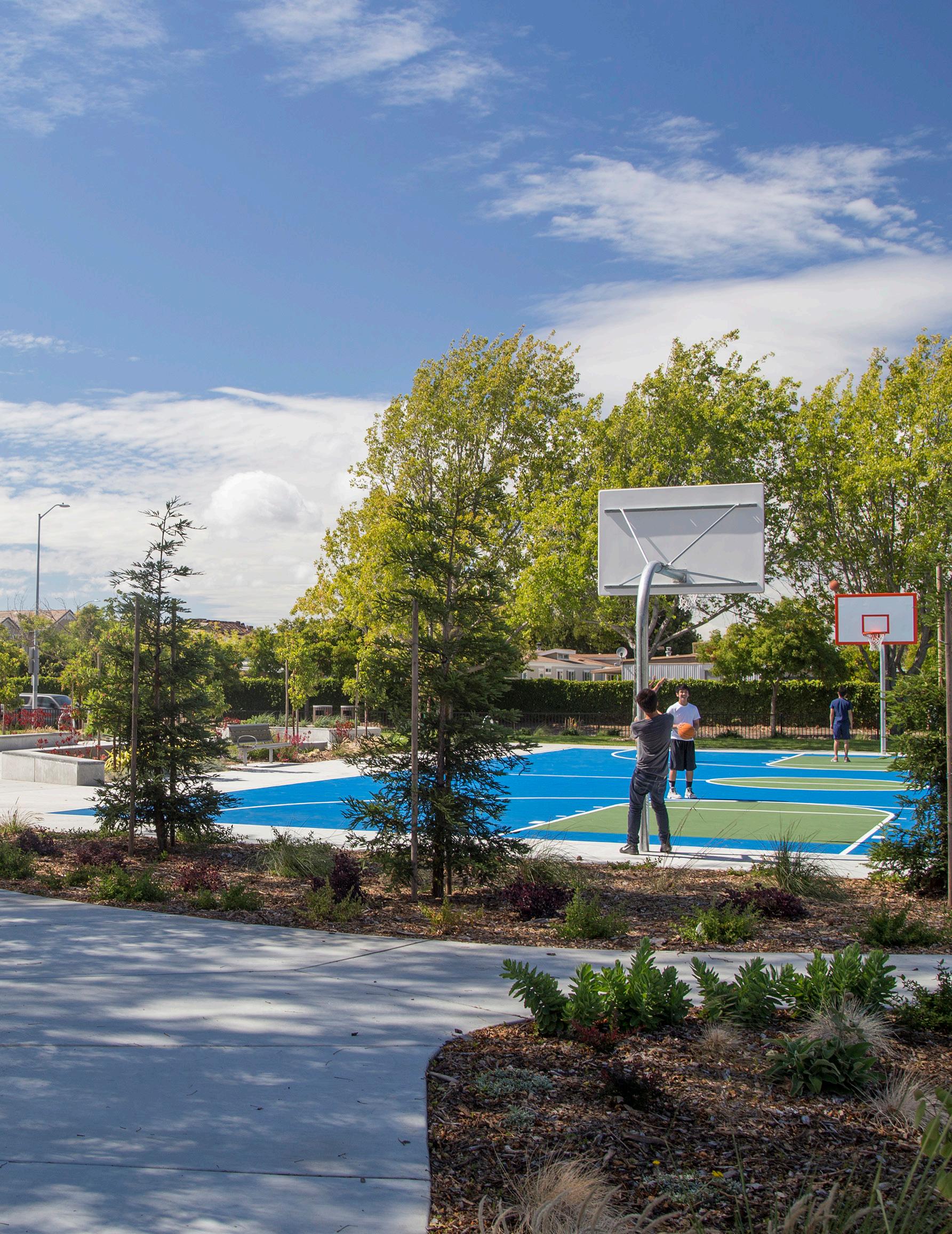 small linear park; sand volleyball court (remove sand); playground; 1/2 basketball court; linear trail (used by EBRPD