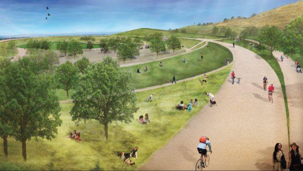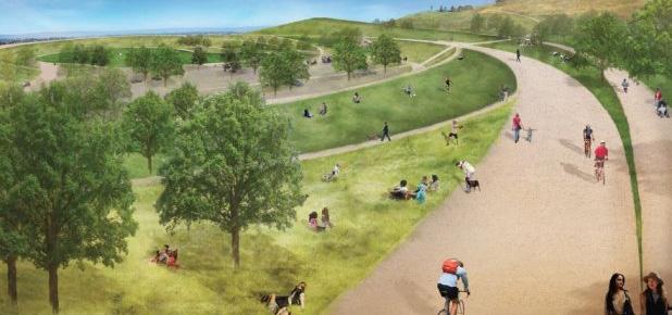 New community park with views ot the Bay and beyond. Park will have soccer pratice field/biorentention area, extensive walking paths, picnic areas, play areas, 1 full and 1/2 baskerball courts, parking, restroom, connections to regional trails. Potential for disc golf and/or dog run at lower portion of park.