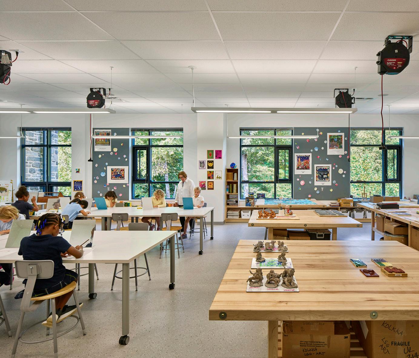 The 78,000 square foot McCausland Lower School establishes a new direction for SCH’s academic facilities by encouraging collaborative innovation by teachers, and makes the natural environment integral to the classroom and as a teaching tool. Located at the edge of the campus, close to the preserved area of the Wissahickon Watershed allows the Lower School to have both environmental and recreational activities nestled along the preserve.