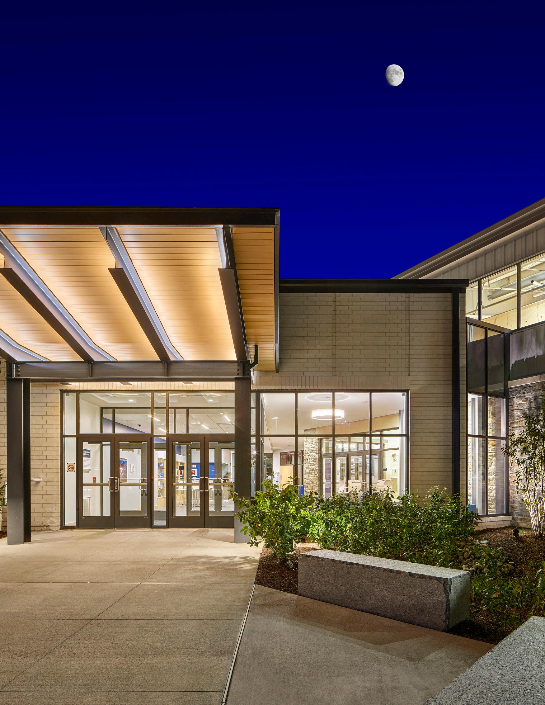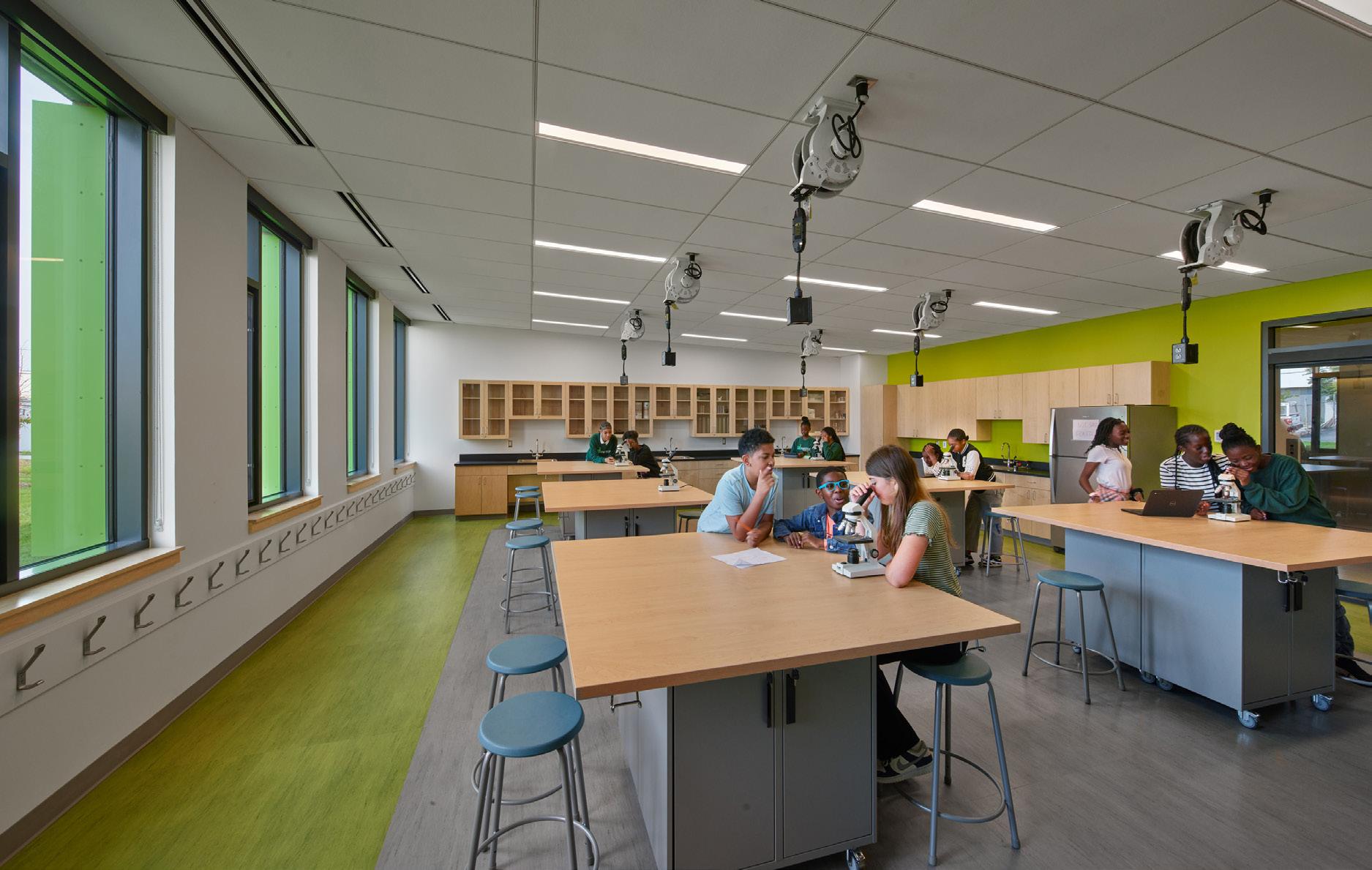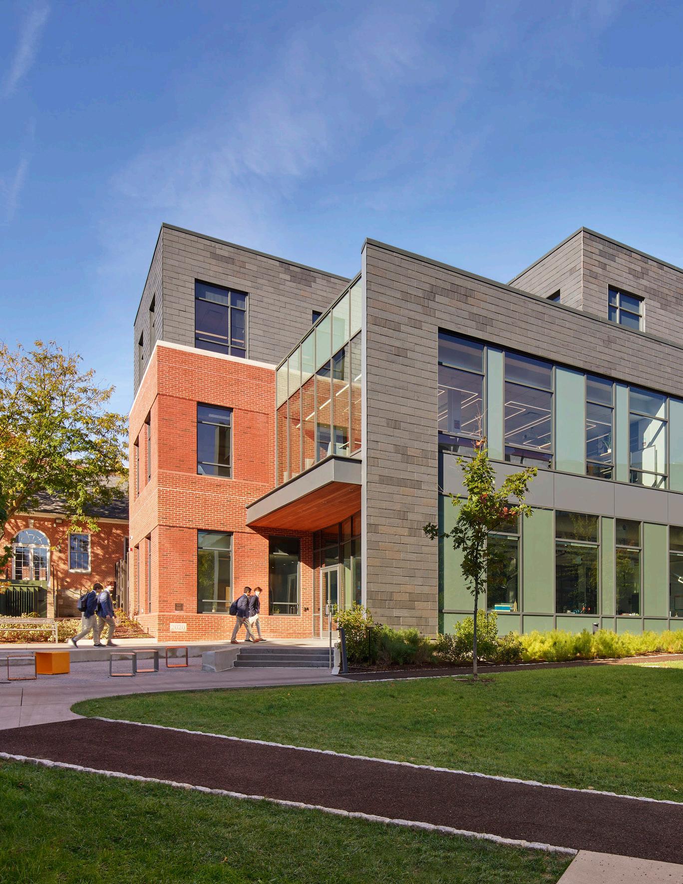 A central commons serves as the main entrance and gathering area, and an updated library and technology center form the new academic heart. The building incorporates a host of sustainable design strategies that extend its function as a teaching tool: rainwater harvesting systems and a green roof introduce storm water management techniques, green materials teach about natural resources, and advanced system controls display the functions and operations of the building. The layout maximizes day-lighting and campus views for the classrooms, and creates informal student spaces that allow circulation areas to also be filled with natural daylight. In addition, it creates outdoor courtyard spaces that connect science classrooms to the natural landscape and provide new outdoor programming opportunities.