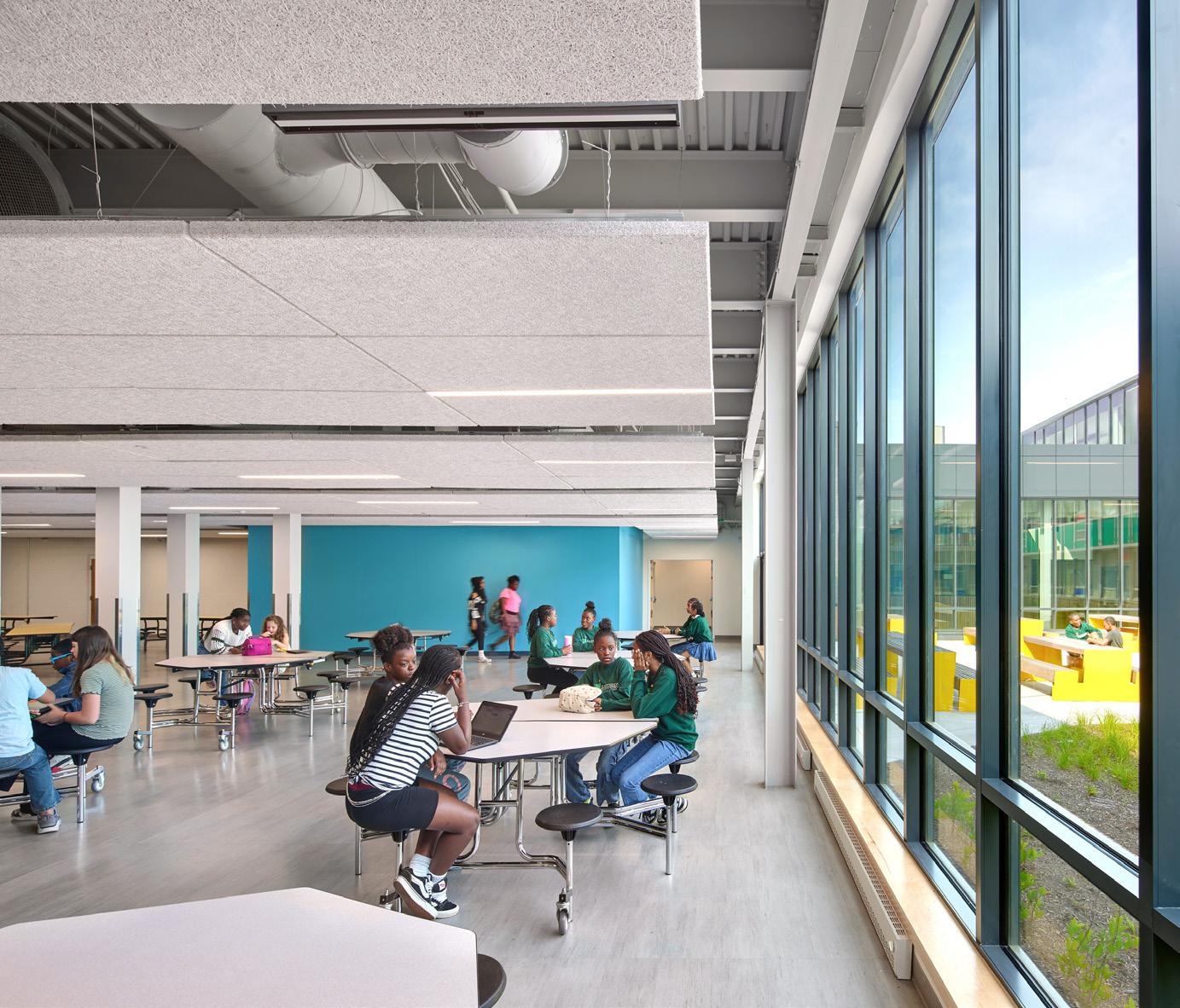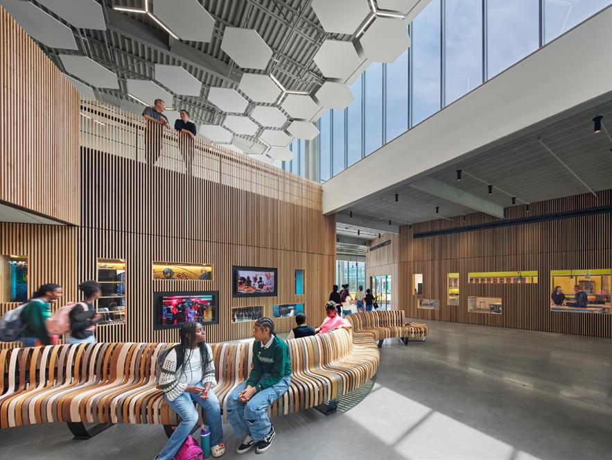 The building has two wings—one for boys and one for girls. In the center of the building is a two-story entry pavilion that functions as a community hub with various seating areas and access to shared multi-purpose spaces and classrooms