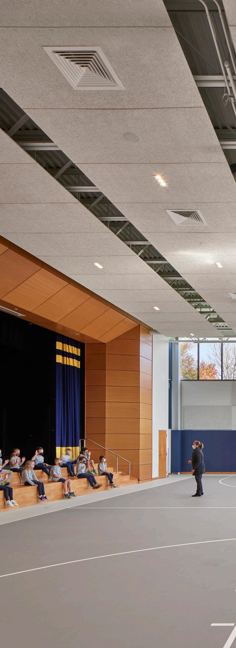 The 4,500-SF multi-performance space is flexible and able to better accommodates school liturgies, assemblies, and school plays. The wood for the performance stage, an abundance of natural light and upholstered retractable maple stadium seating creates a beautiful atmosphere that functions well for both basketball practice and PE classes, while also transforming seamlessly for theater performances and assemblies. Floor-to-ceiling windows and window seating provides beautiful views of campus from the lobby and gallery space. Teachers and staff can observe activities on the new turf field from the community room.