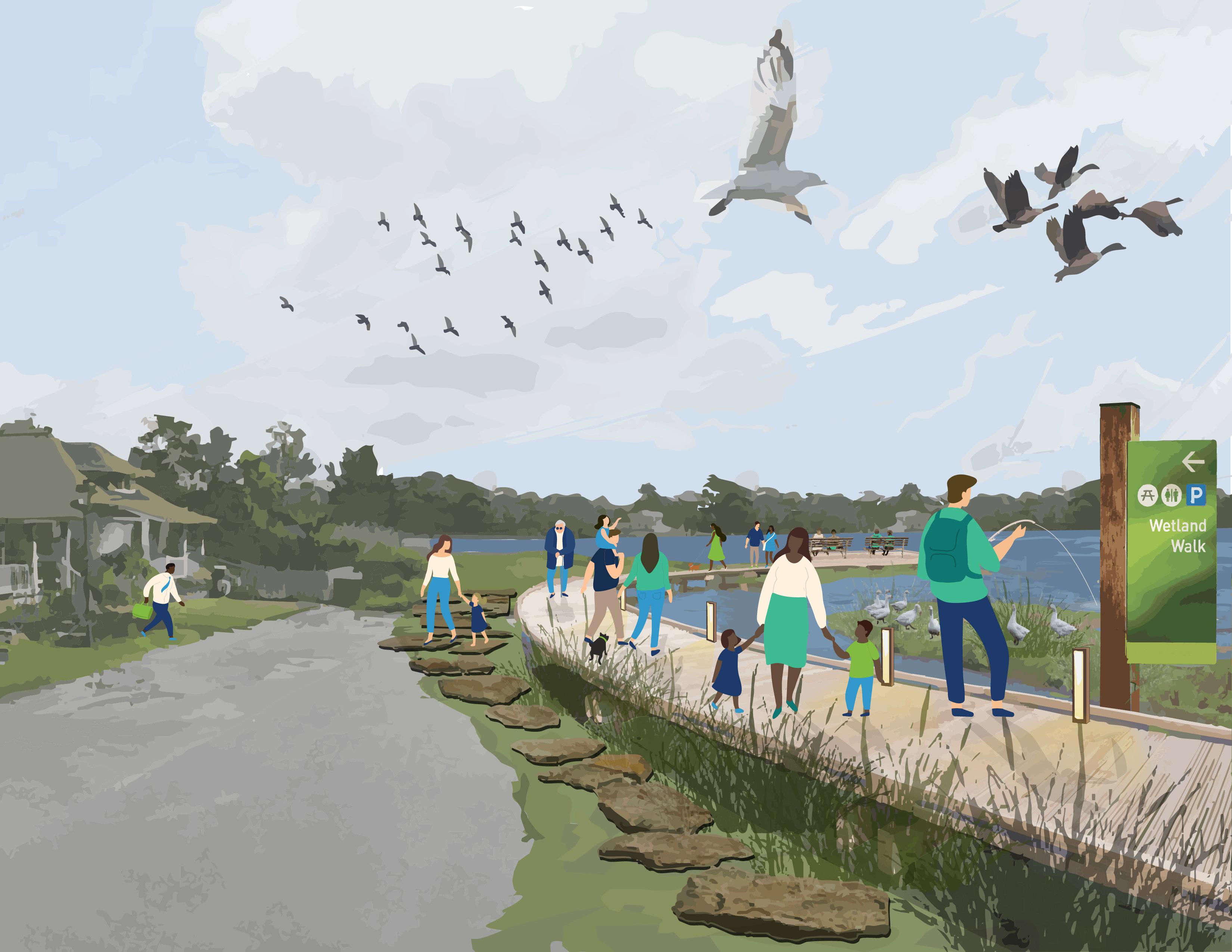 Develop coastal infrastructure as a waterfront amenity, including blue parks, living shorelines, and waterfront trails.