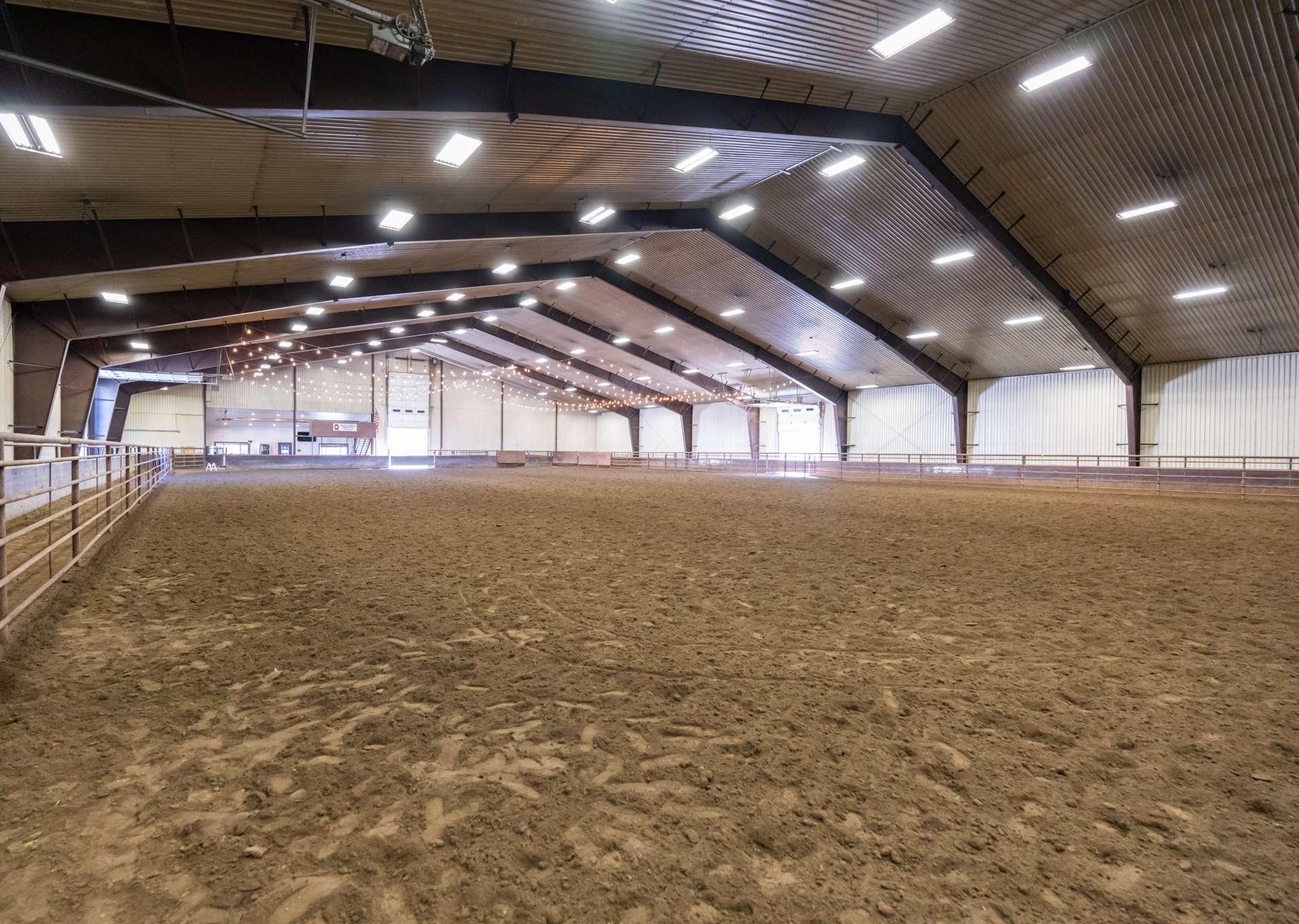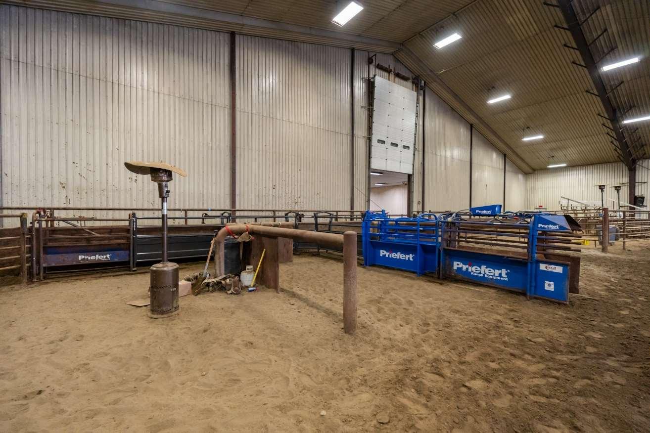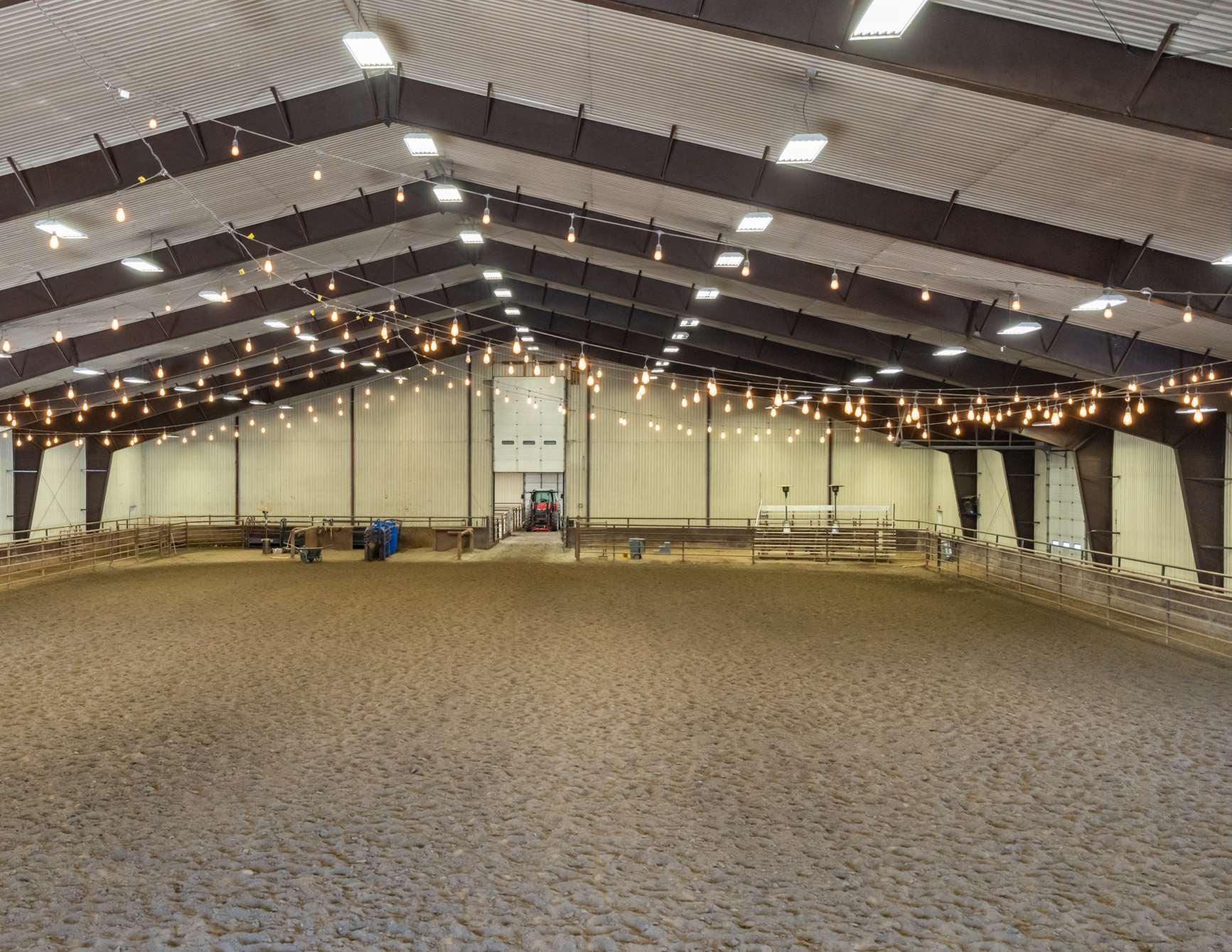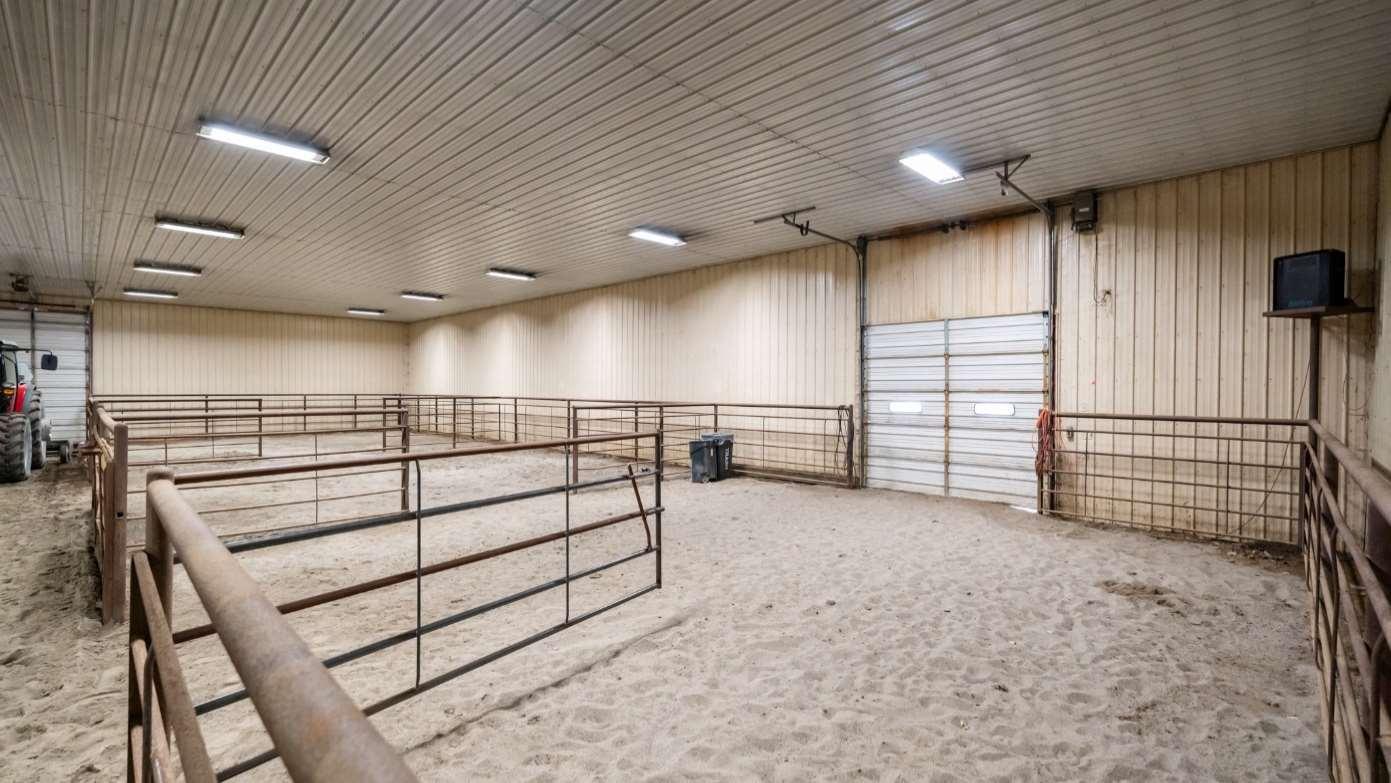 Expansivesteel-framedarenaisversatile,serving primarilyforequestrianactivitiesandeventsbutalso accommodatingweddingsandothergatherings.The eastendofthearenahousesaconcessionstandwith anareaforspectatorstoviewordine,alongsidean announcer'sboothequippedwithanewPAandaudio system.Attheotherend,there’sanattached100x85 holdingbarnwithpensforlivestock,and100’leadup, forstartsandfinishesinbarrelracing.Thewarm-up barn,adjacenttothemainarena,isfullyinsulatedand perfectforpre-eventpreparationsoradditionalevent space.Theflooringconsistsofscreenedsand,andis equippedw/integratedPAtotheMainArena.